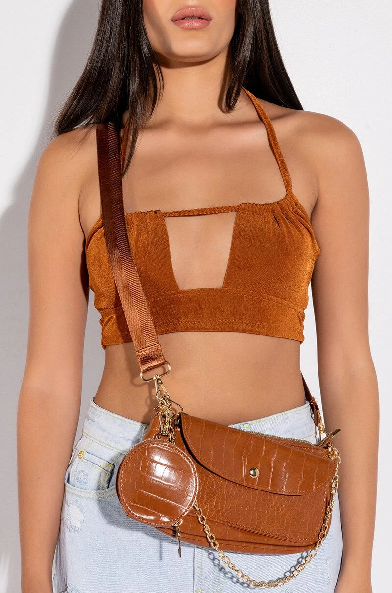The AKIRA Label On Period Rust Baguette is a chic baguette bag featuring a collage of clutches encapsulated in one chic convertible piece. This croc embossed vegan leather number includes a slim zip top baguette bag base, an adjustable woven shoulder strap, a detachable flap front envelope clutch with chain link handle, and a detachable circular zip top pouch.