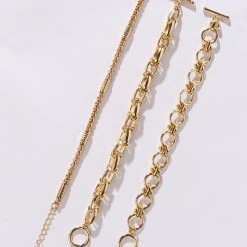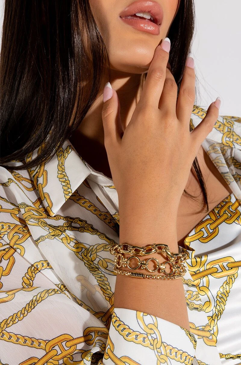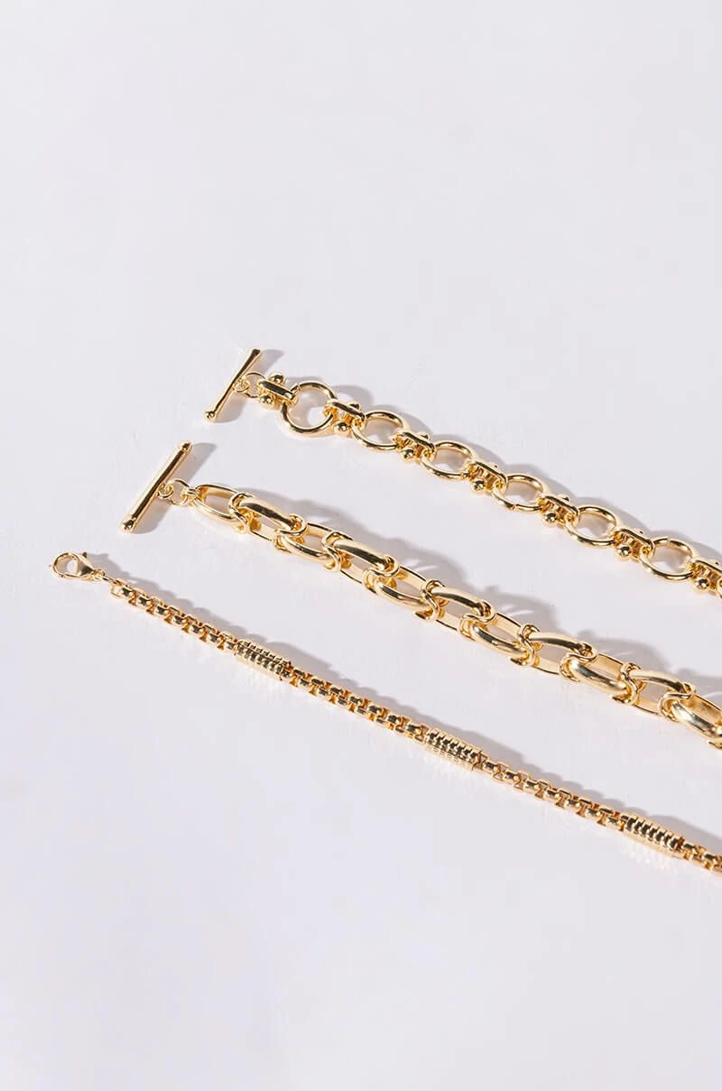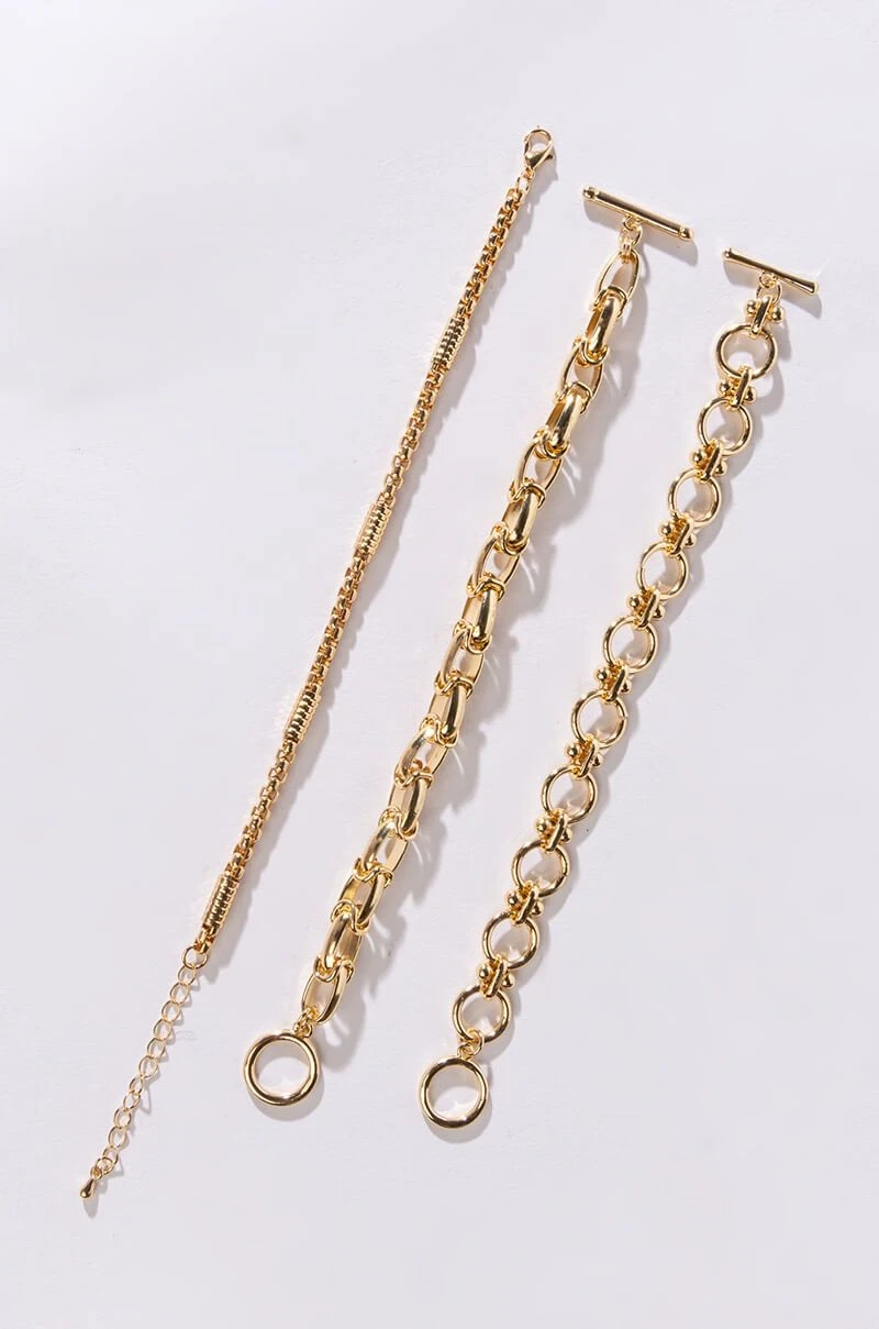 Turn over a new leaf with The AKIRA Label Overturn Chunky Bracelet Set. This collection features three unique, individual silver chain pieces. Includes one slim chain piece with a lobster claw clasp and two link chains with bar and ring toggle closures. Amp up your accessory collection with these classic bracelets.