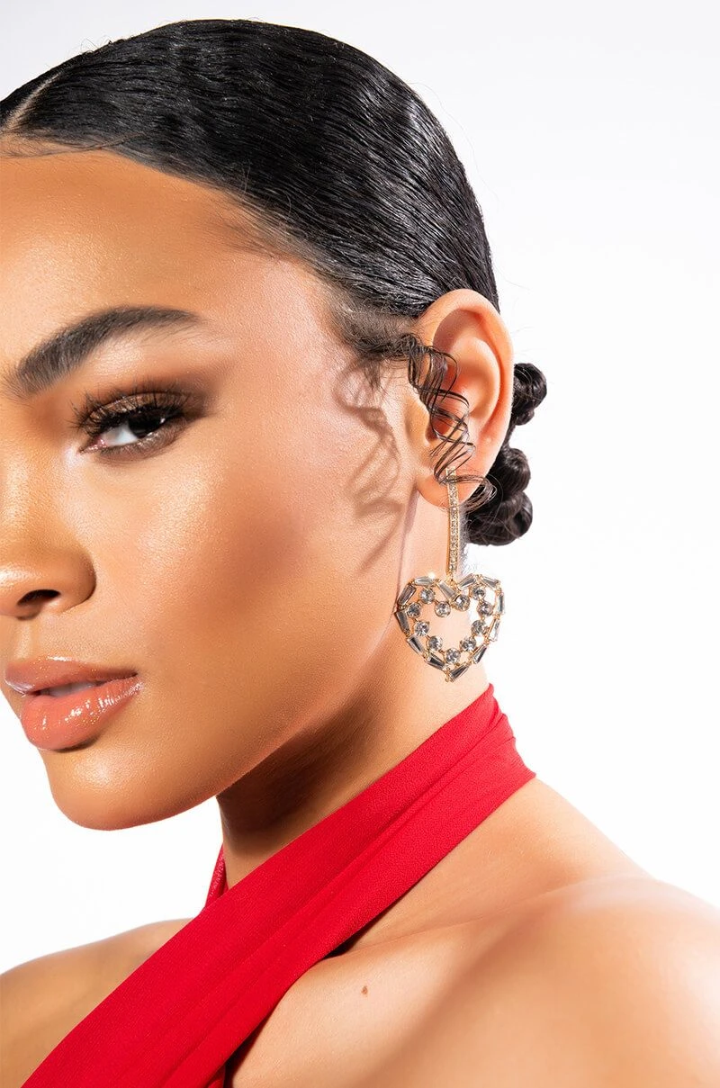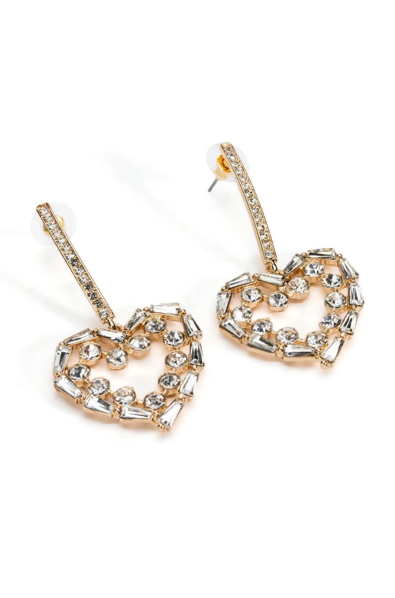 The AKIRA Label Piece Of My Heart Rhinestone Drop Earrings are made from a faux gold metal base and feature open hearts with clustered rhinestone detailing and thin, curved rhinestone bar lobe posts. Complete with post back-style closures.