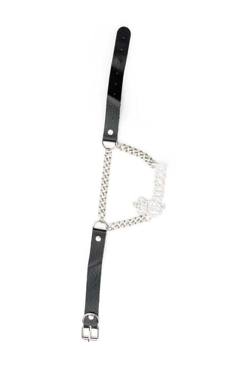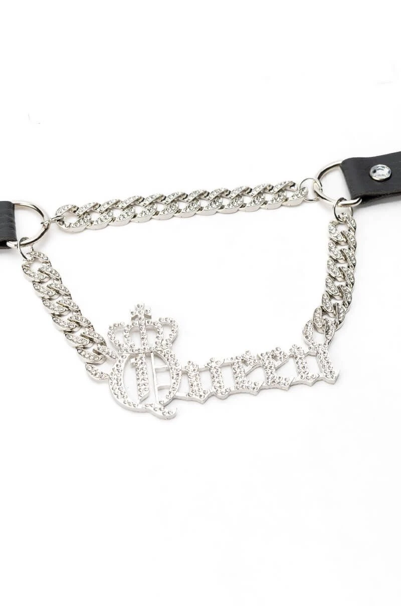 The AKIRA Label Queen Bee Leather Choker is made from an adjustable faux leather belt base and features D rings connected to a rhinestone curb chain with a crowned rhinestone βQUEENβ gothic script nameplate design. Complete with a buckle closure.