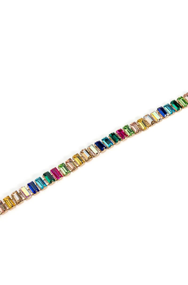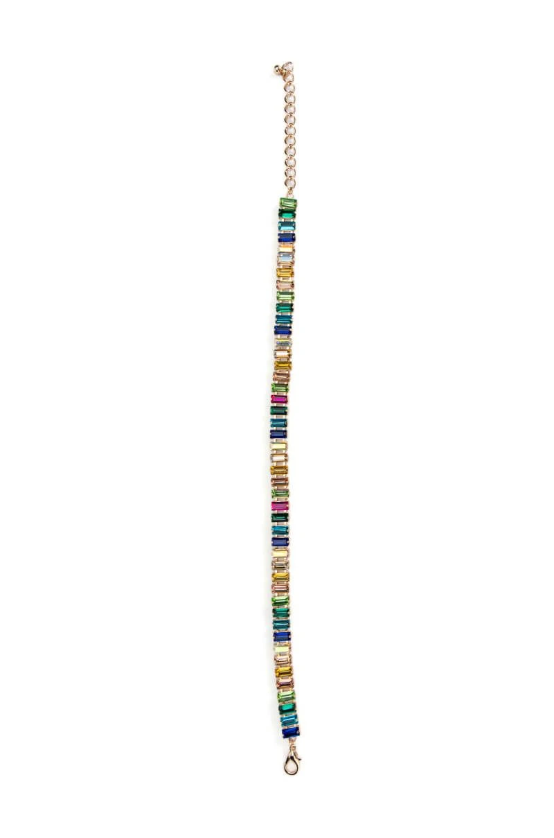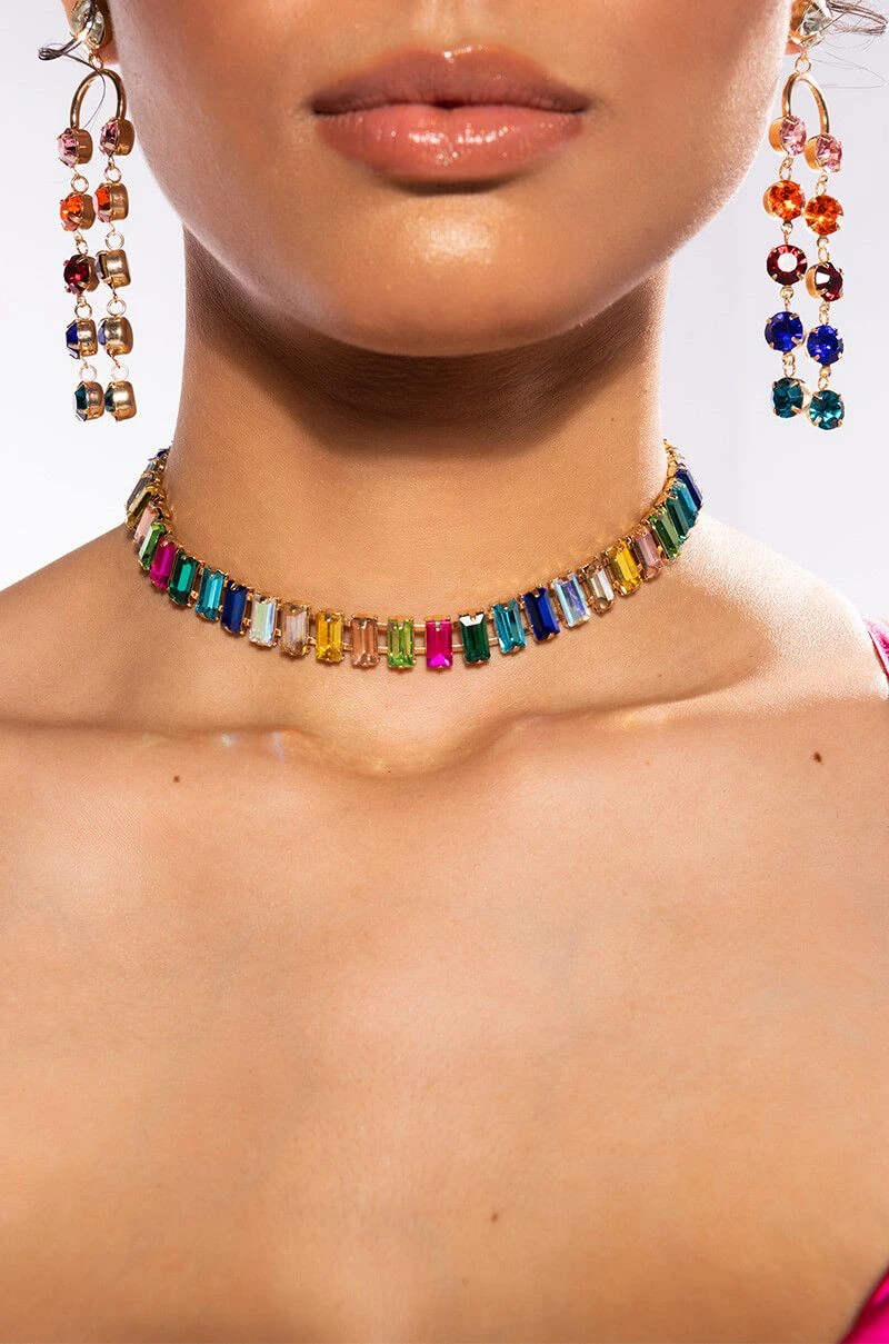 Let your true colors shine with The AKIRA Label Rainbow Drip Rhinestone Choker! This colorful piece is made from a faux gold metal base and features a choker silhouette with linked rainbow rhinestone gems and an adjustable lobster claw closure.
