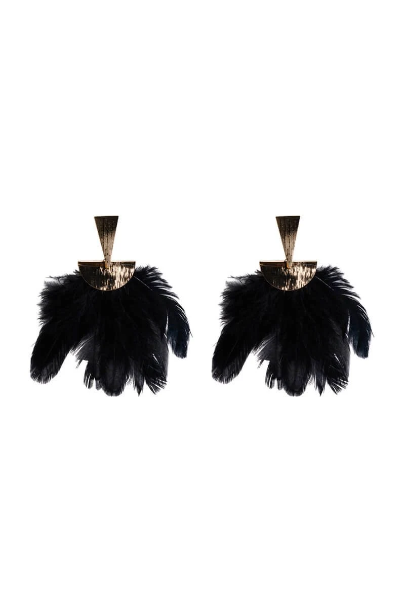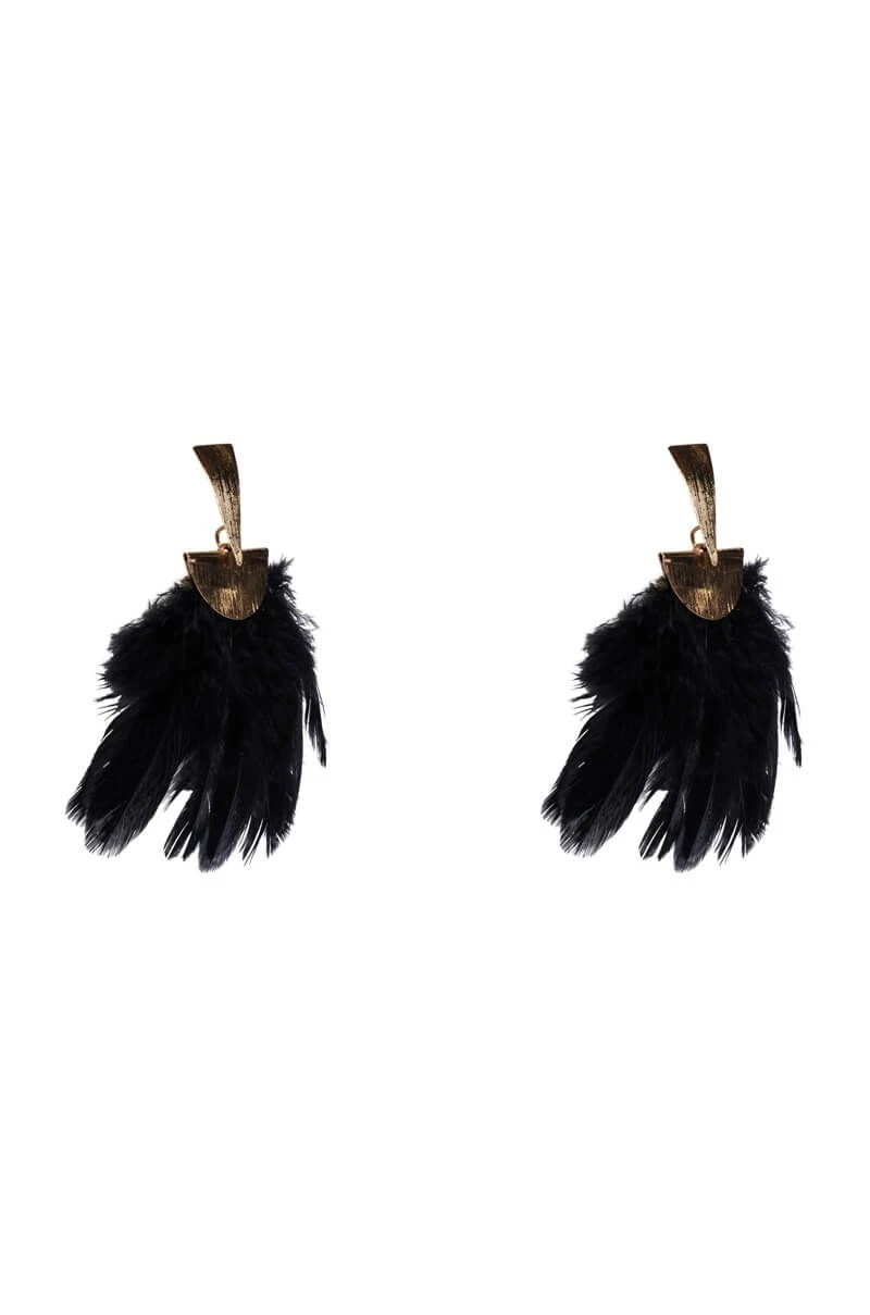 The AKIRA Label Raise Your Standard Feather Earrings are made from a brushed faux gold metal base and feature triangular posts, a drop silhouette, and a coordinating half circle metal disc with opulent feather detailing. Complete with post back-style closures.