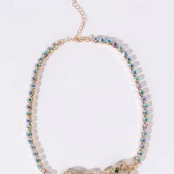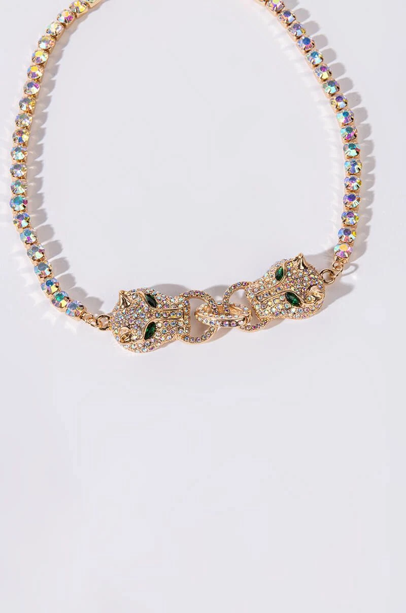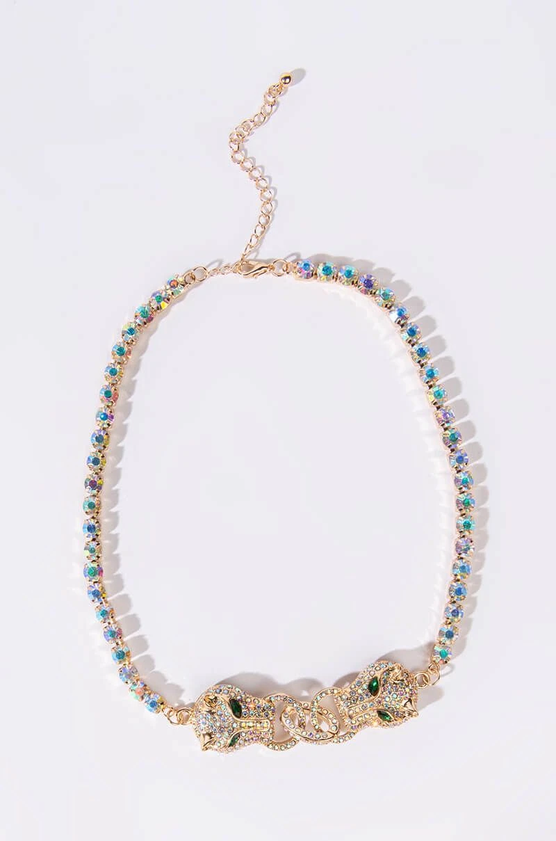 The AKIRA Label Reflection Of You Rhinestone Necklace is an ultra luxe necklace made with a faux gold base and features an iridescent rhinestone link design, interlocked fierce cat pendants with iridescent rhinestone detailing, and an adjustable lobster claw closure.