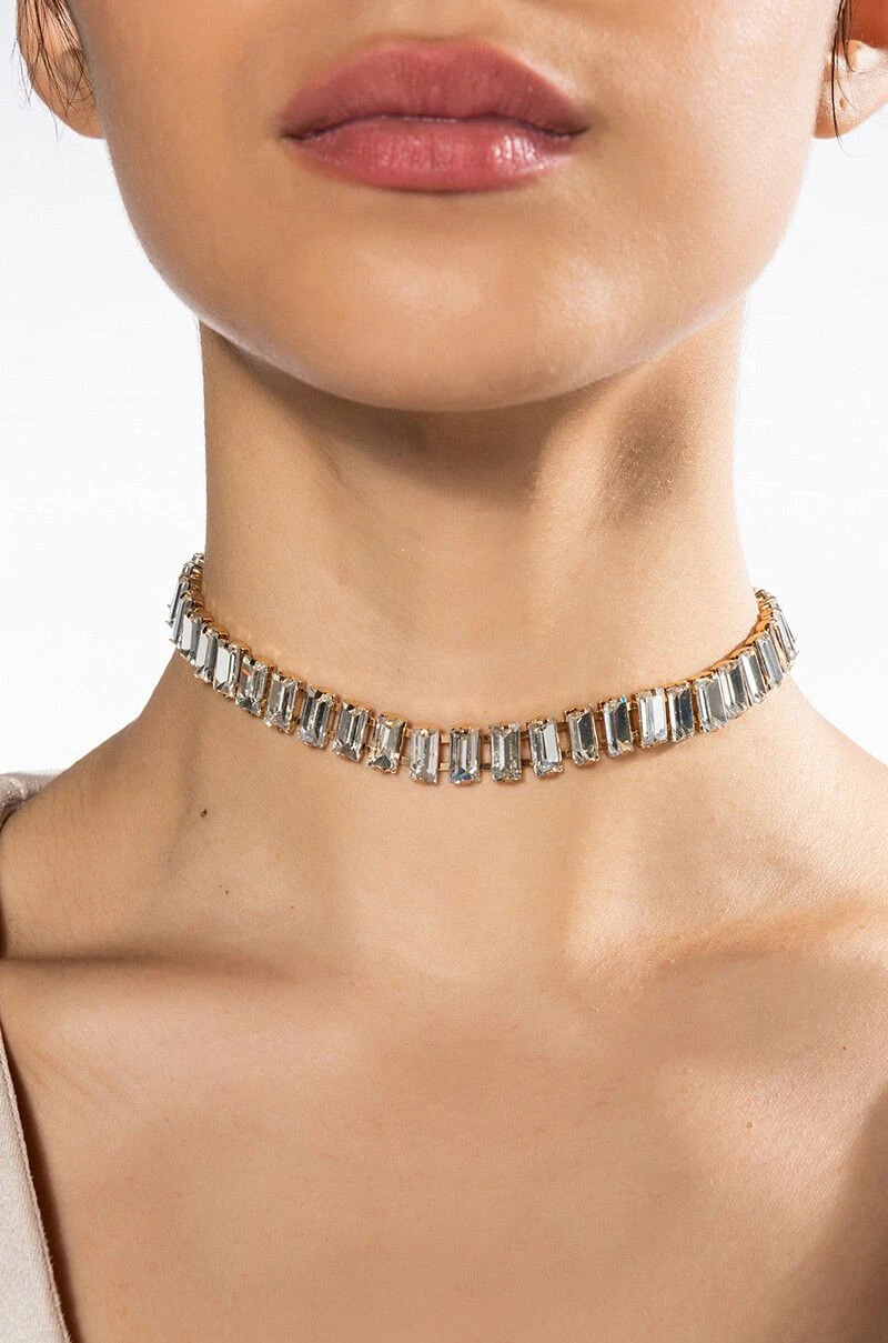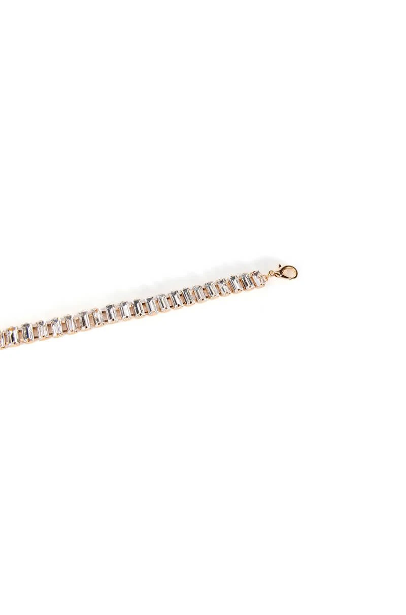 The AKIRA Label Respect The Lifestyle Rhinestone Choker is made from a faux gold metal base and features a choker silhouette with linked rhinestone gems and an adjustable lobster claw closure.