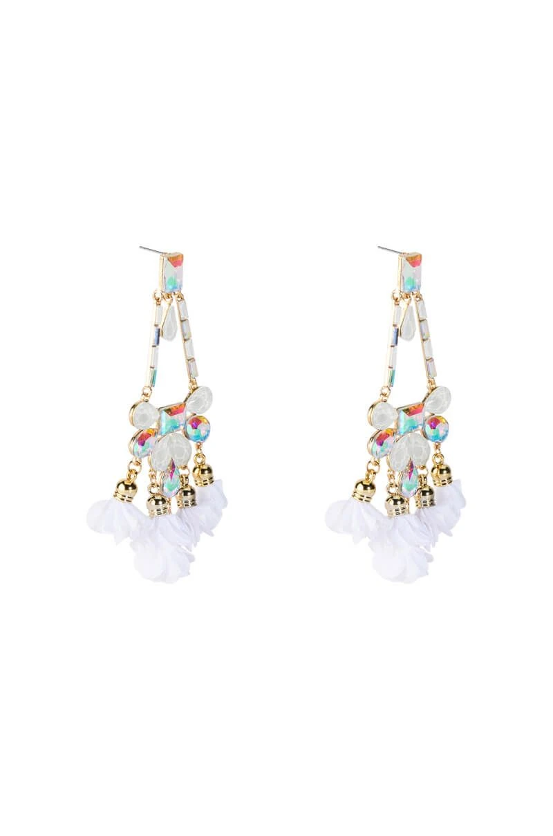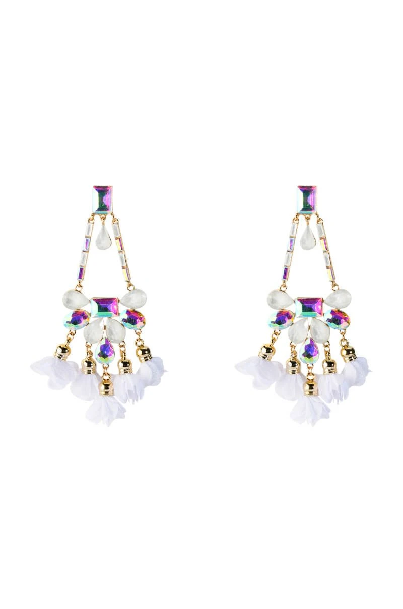 The AKIRA Label Romanticize Life Earring are made from a faux gold metal base and feature iridescent gemstones, a drop dangle silhouette with a gem lobe post, and cascading rhinestone and floral petal accents. Complete with post back fastenings.