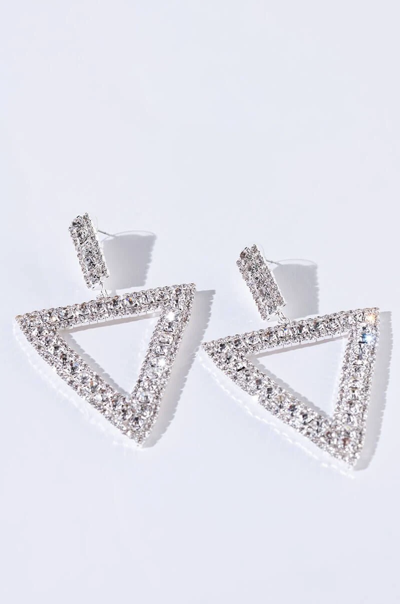The AKIRA Label Royalty AF Rhinestone Earrings is a sparkling accessory featuring a rectangular stud post, triangle dangle, rhinestone adornments, and a drop-style design. Complete with a traditional post back-style closure.