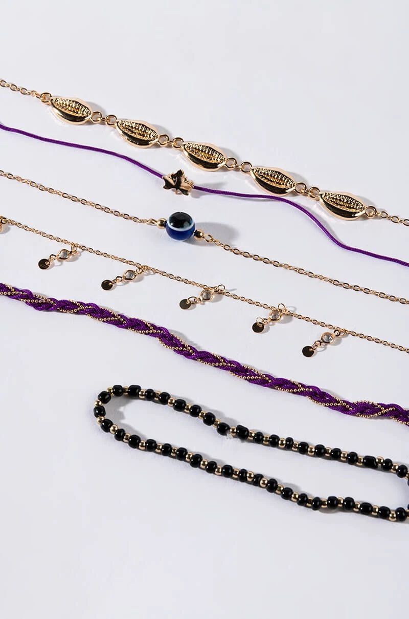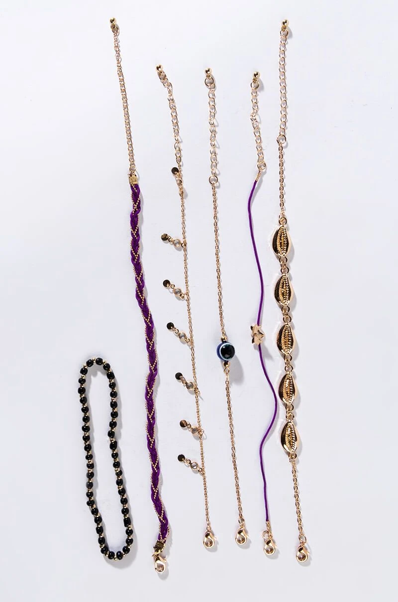 Transport yourself to a vacation state of mind with The AKIRA Label Santorini Anklet Set! This anklet set features six unique pieces, each made from faux gold bases. One with an elasticized beaded silhouette, one with faux gold metallic cowrie shell detailing, one with a braided base, one with an evil eye charm, one with dangling clear gemstones , and one with a grape leaf charm accent. All are complete with adjustable lobster claw closures.