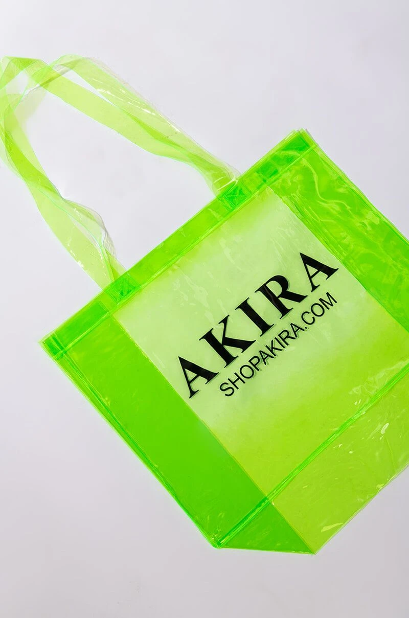 Live transparently, and leave a fashionable legacy. The AKIRA Label Secure The Bag AKIRA PVC Shopping Bag is an chic top handle tote featuring a translucent PVC body, AKIRA Logo detail, and a vibrant neon colorway. Transport your belongings in style, sustainably.