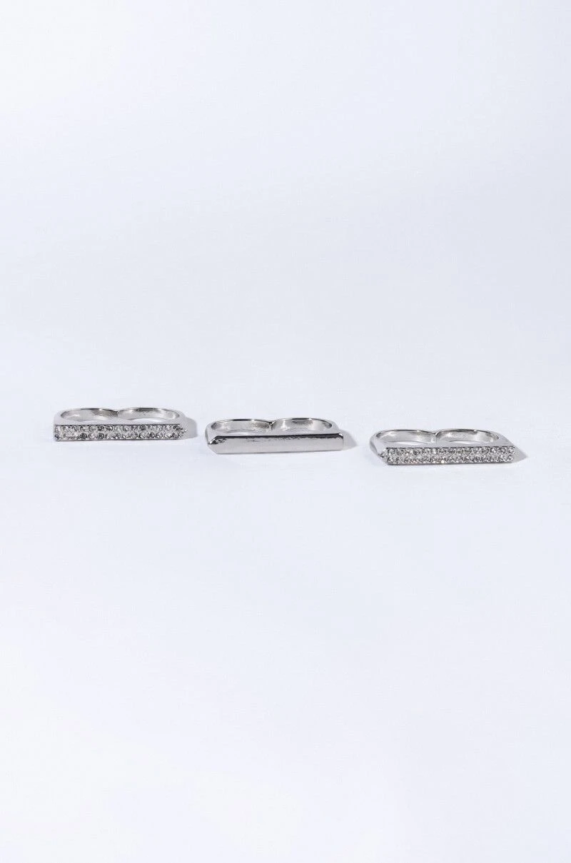 The AKIRA Label Set The Bar High Ring Set is a set of three fierce two-finger bar rings with rhinestone detailing. Wear them separately or layer them up for all the bling!