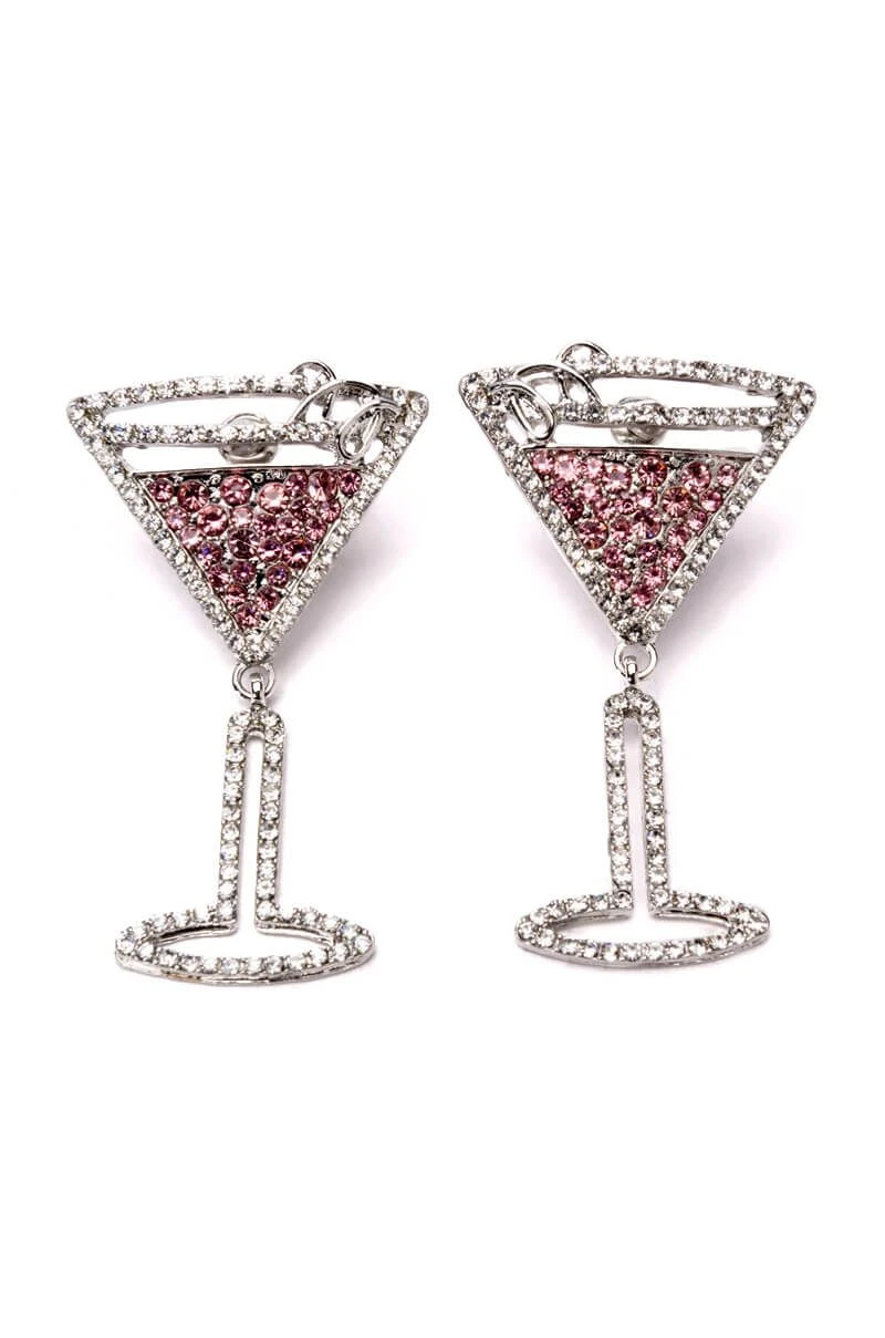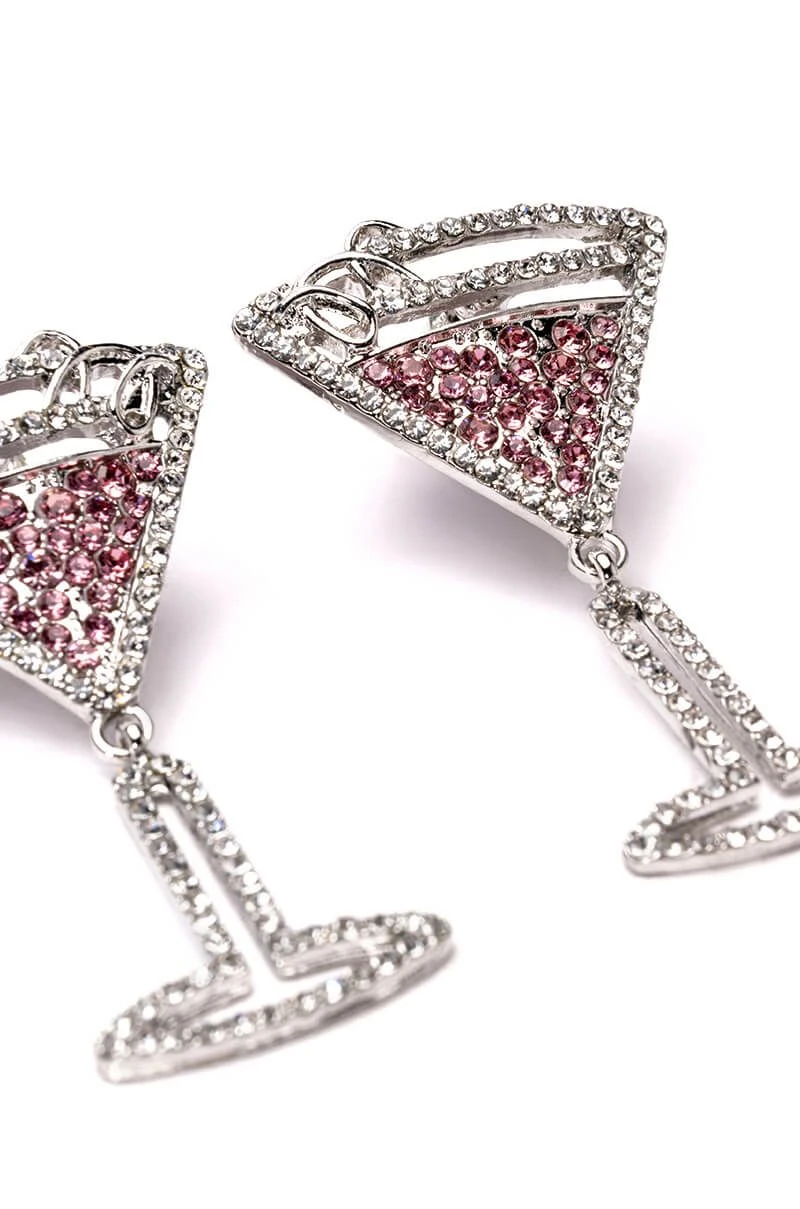 The AKIRA Label Shaken Not Stirred Embellished Earrings are made from a faux silver metal base and feature rhinestone-embellished martini glass designs with stem drop accents. Complete with post back-style closures.