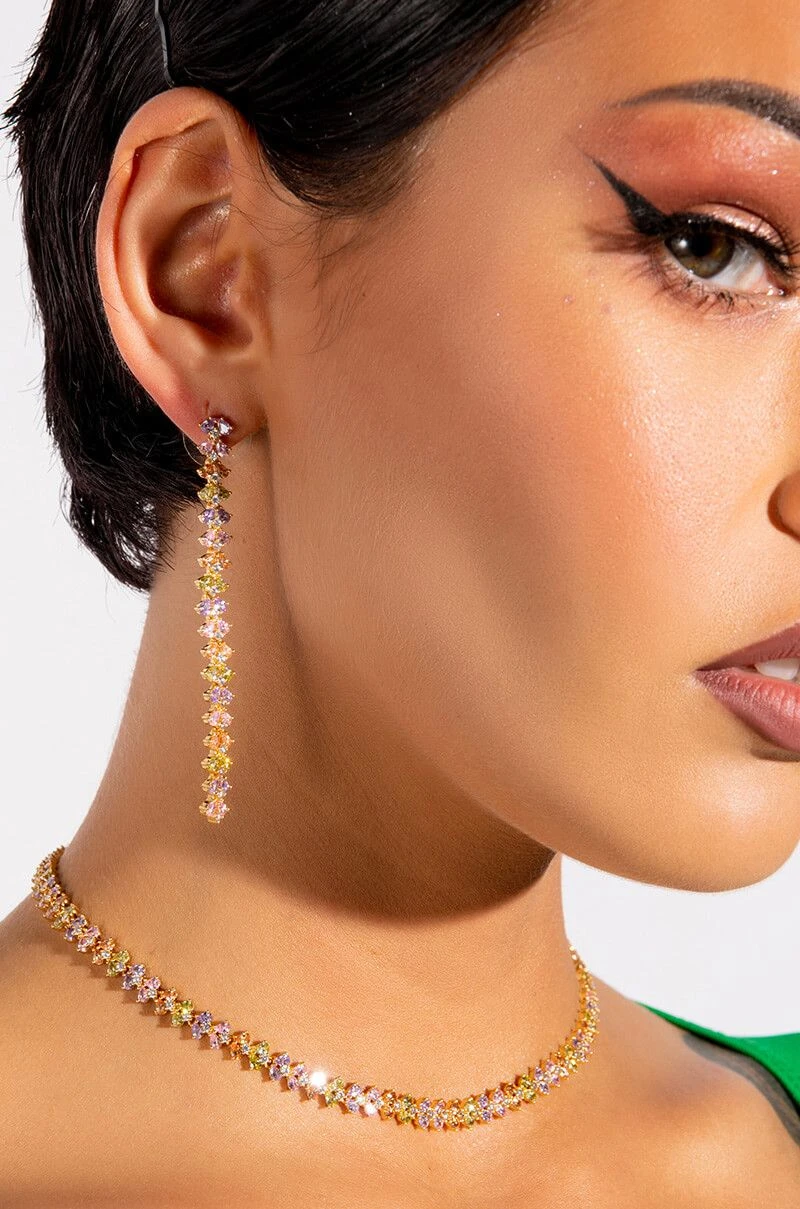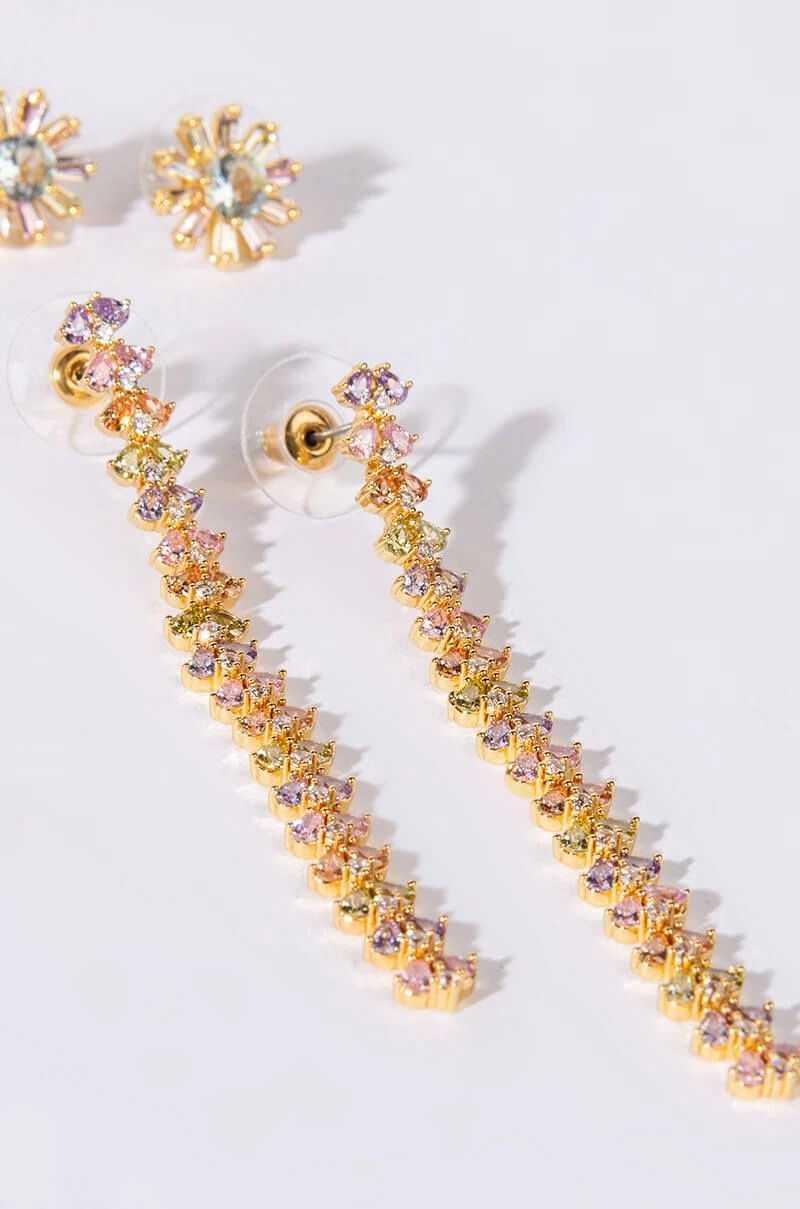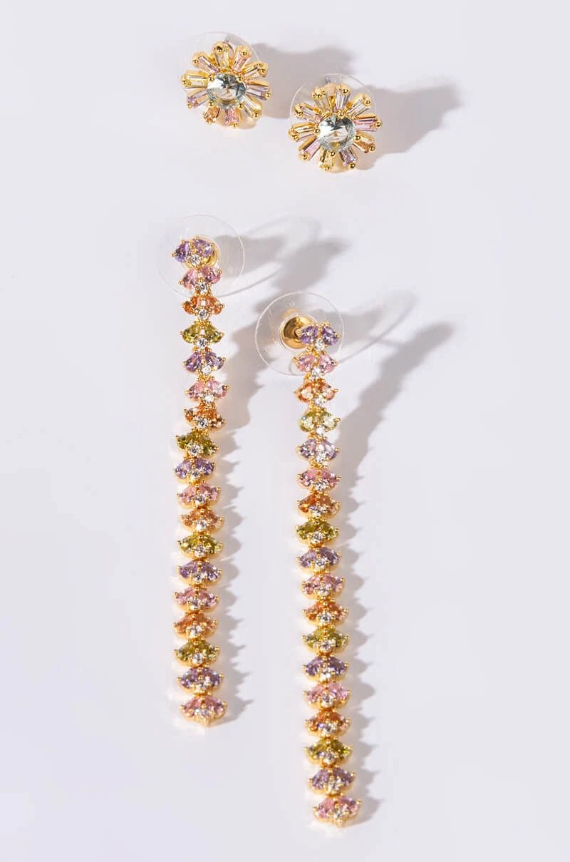 The AKIRA Label Shame On Me CZ Studs are a set of two gold plated earrings featuring cubic zirconia gemstones: one floral stud and one long vertical dangle earring. Both are complete with post back style closures.