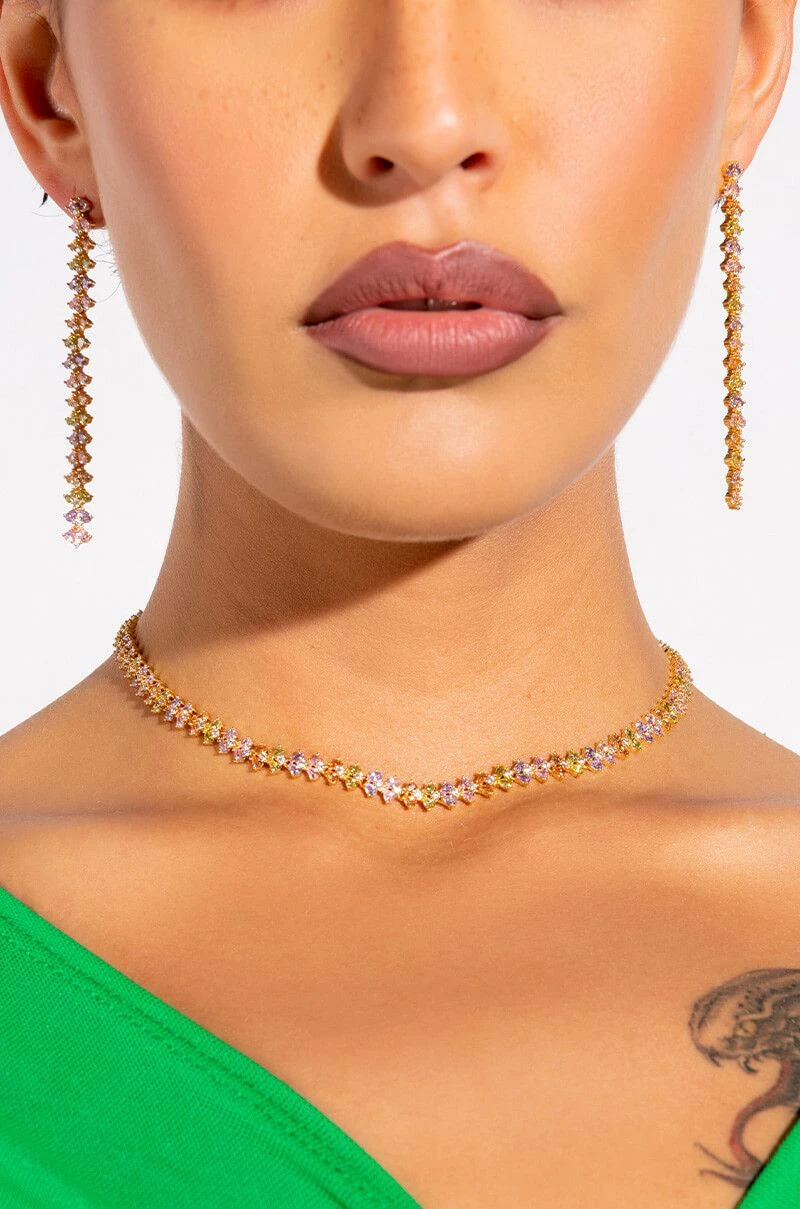 The AKIRA Label Shame On Me CZ Necklace is a gold plated cubic zirconia necklace featuring super sparkly colorful cubic zirconia stones and an adjustable lobster claw fastening. Pairs perfectly with the coordinating Shame On Me Tennis CZ Bracelet and the Shame On Me CZ Studs.