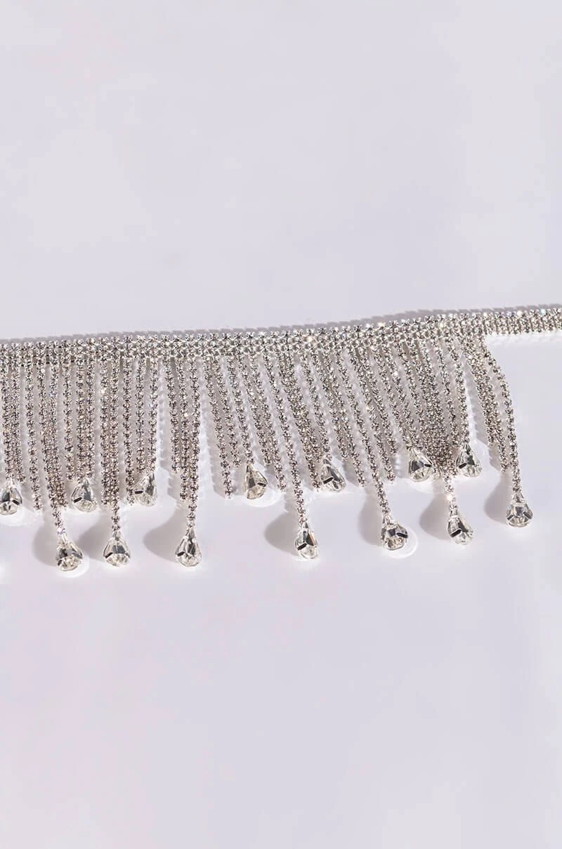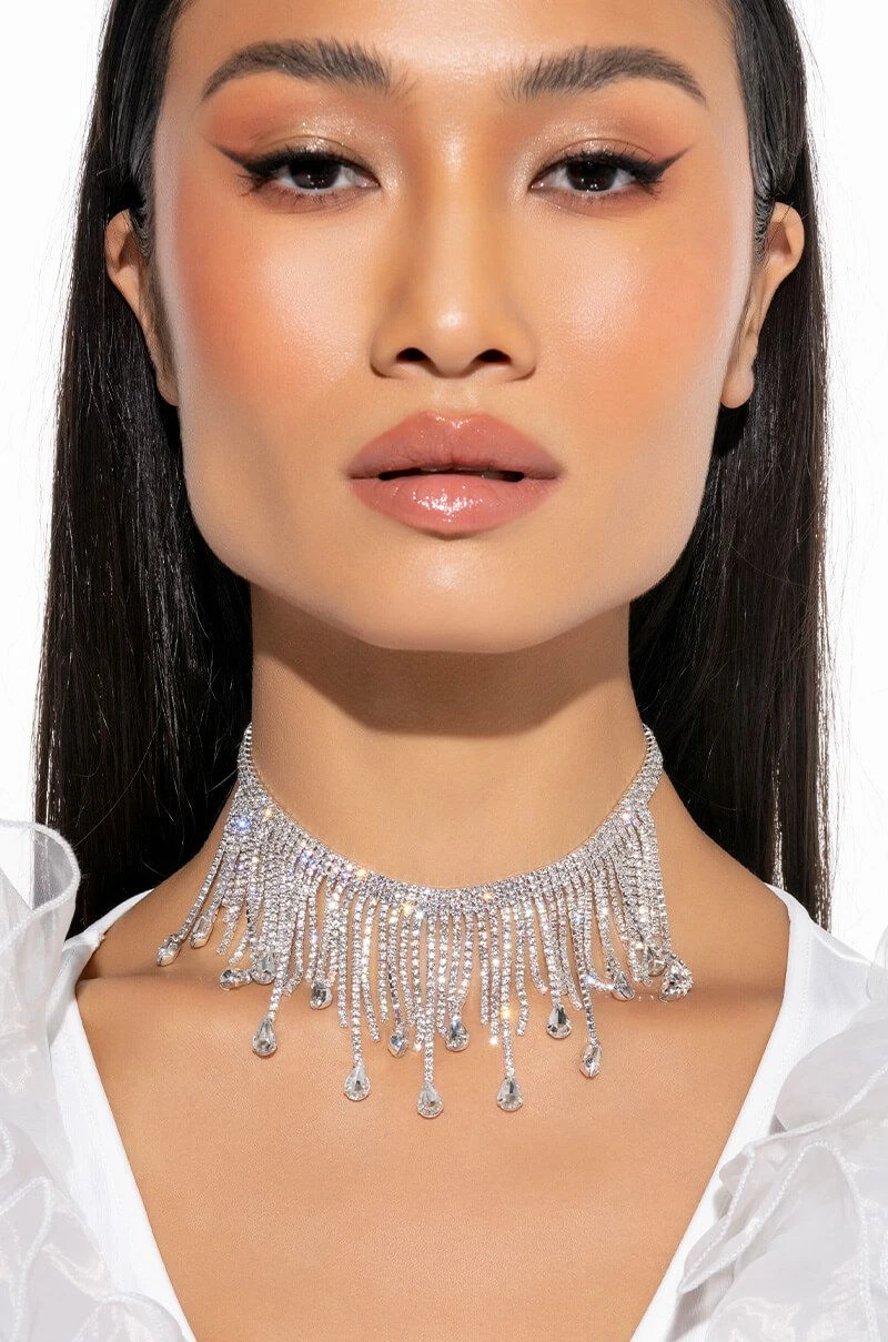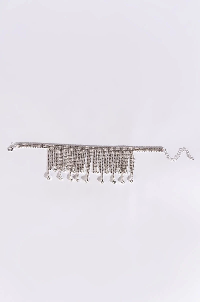 The AKIRA Label Sheβs A Maniac Dropping Choker features a rhinestone link base, dangling rhinestone fringe, rhinestone teardrop accents, and an adjustable lobster claw fastening.