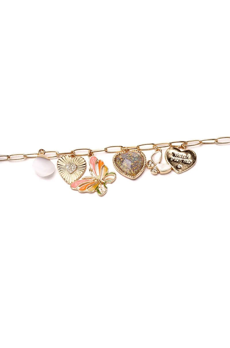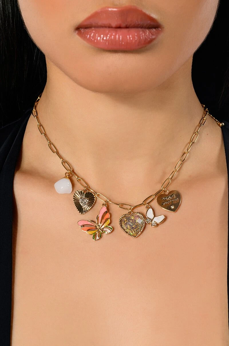 Take a second look at The AKIRA Label So Charming Chain Necklace. This chain link faux gold necklace features a choker silhouette, multiple unique charm accents, butterfly and heart pendants, stone detailing, and an adjustable lobster claw fastening.