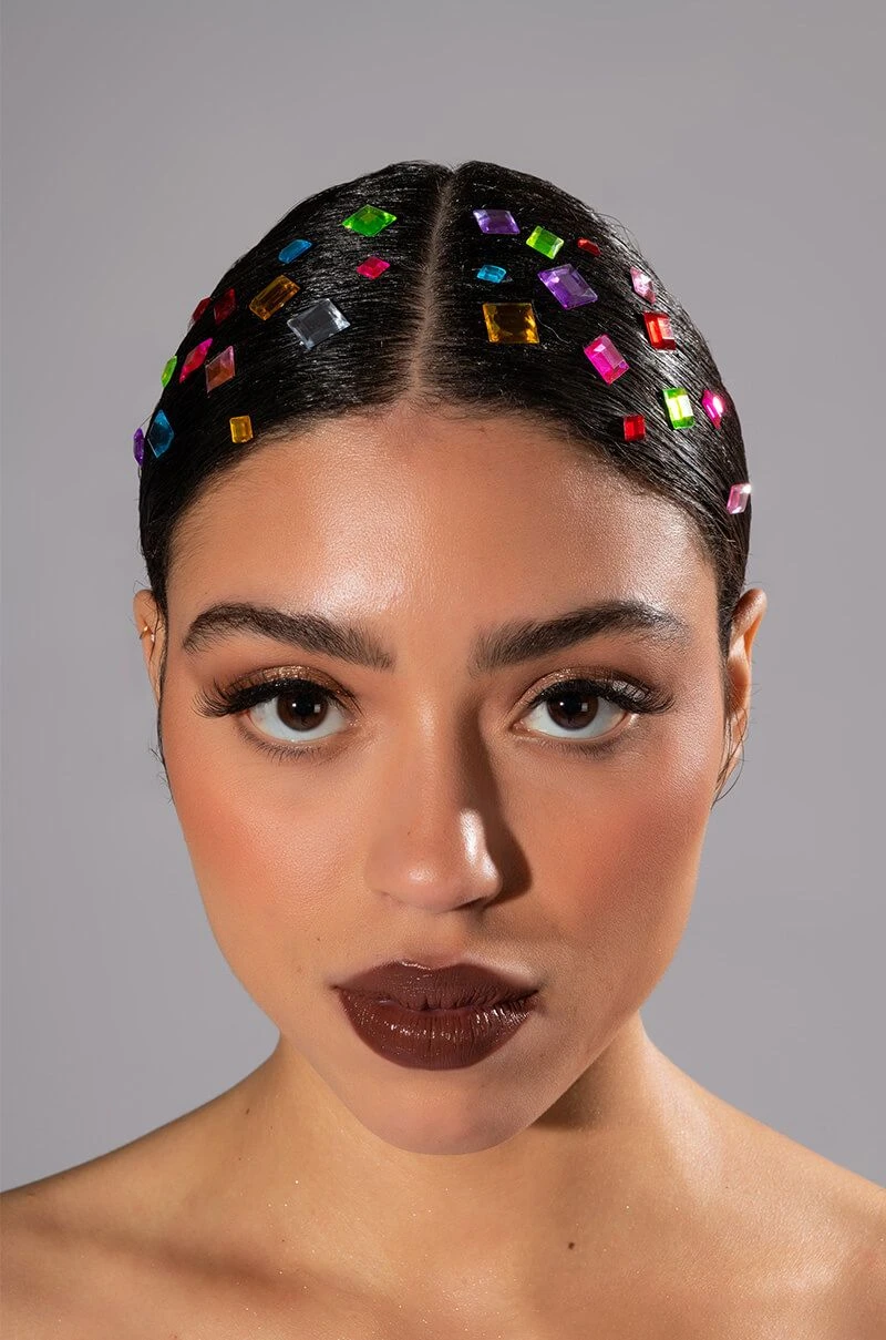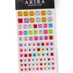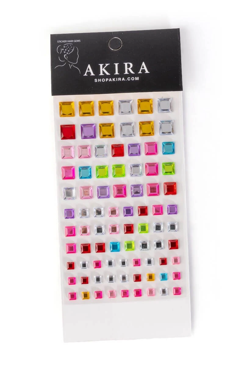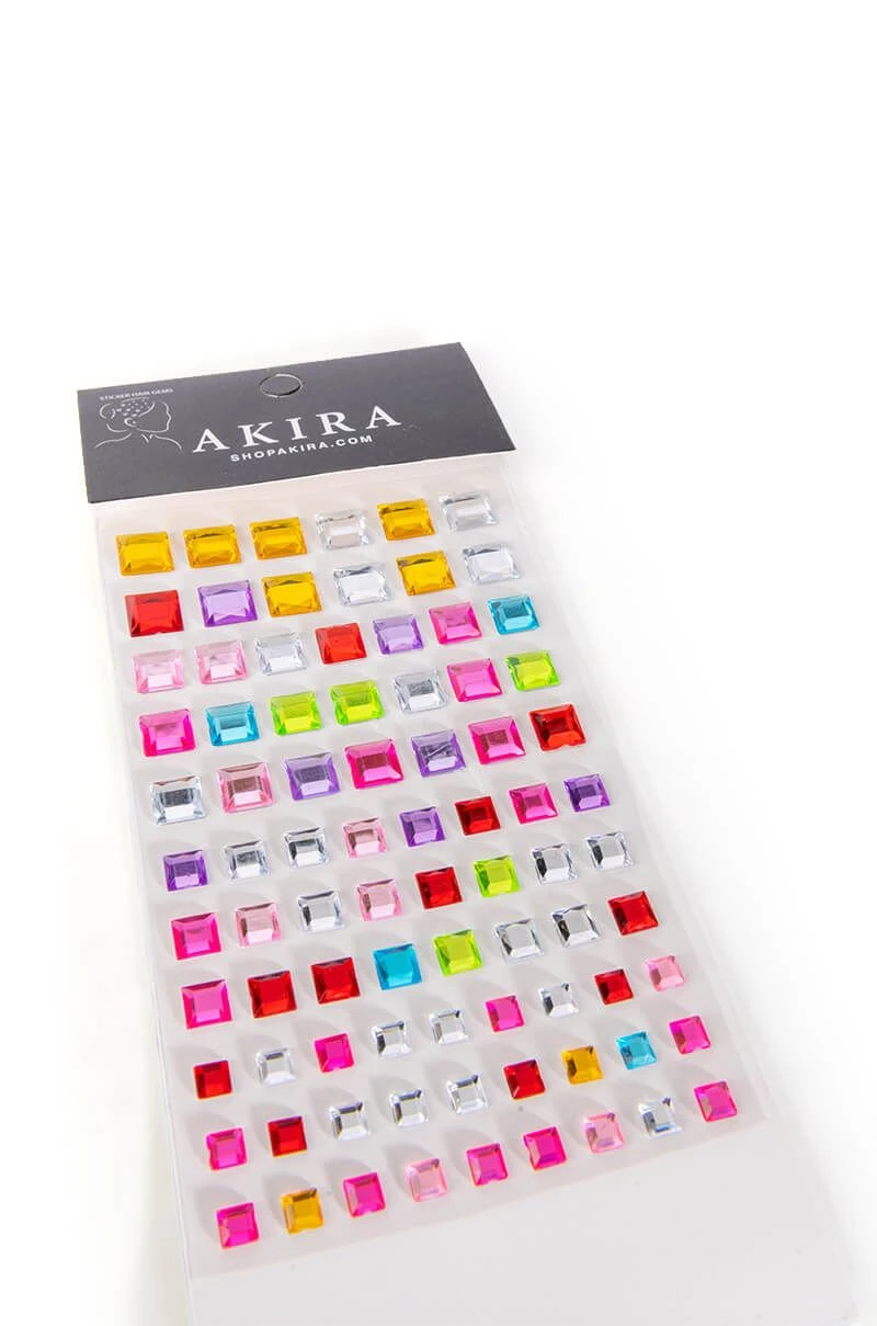 The AKIRA Label Square Hair Gem Stickers in Multi are an adhesive, single use hair accessory featuring square, multi-color rhinestone stickers of various sizes on a clear backing.