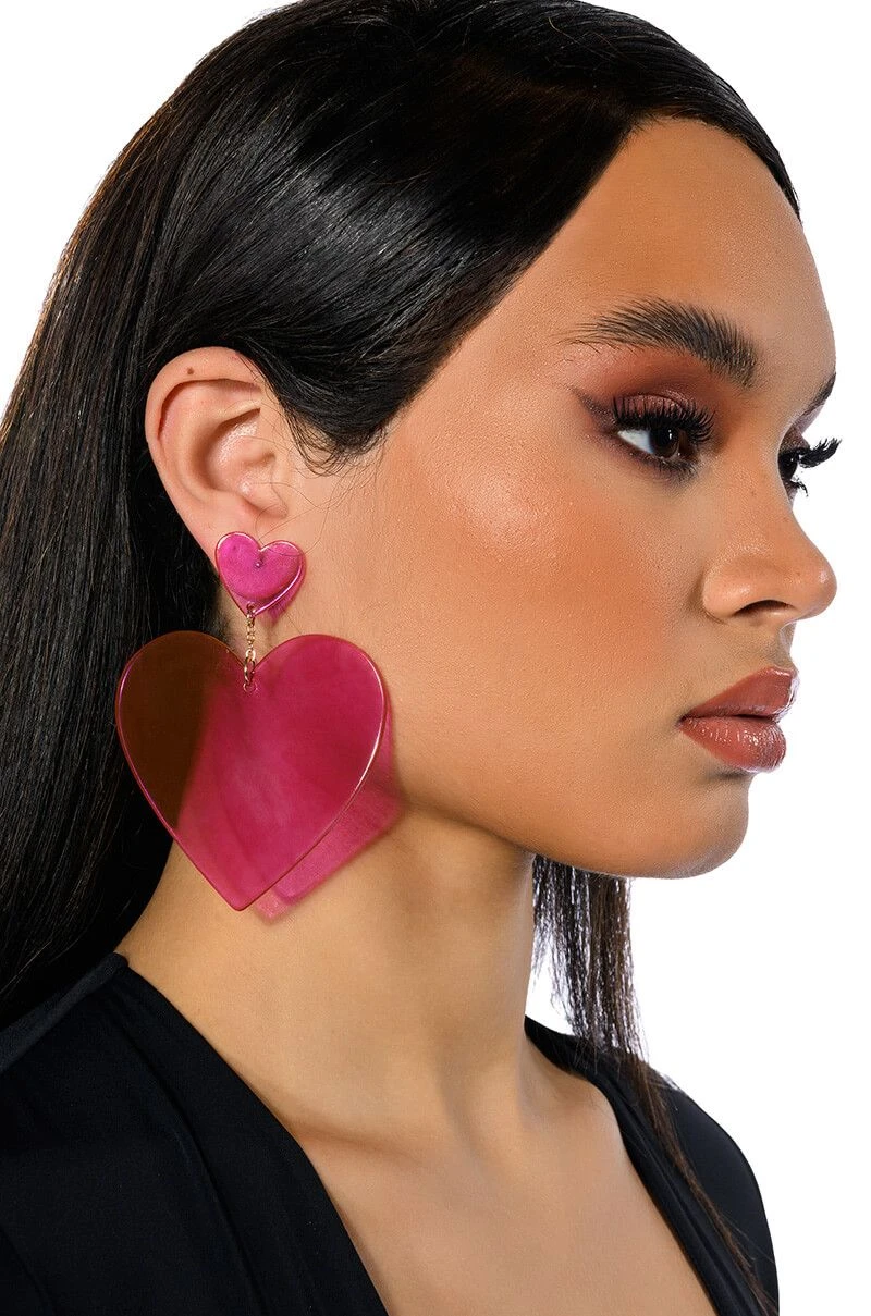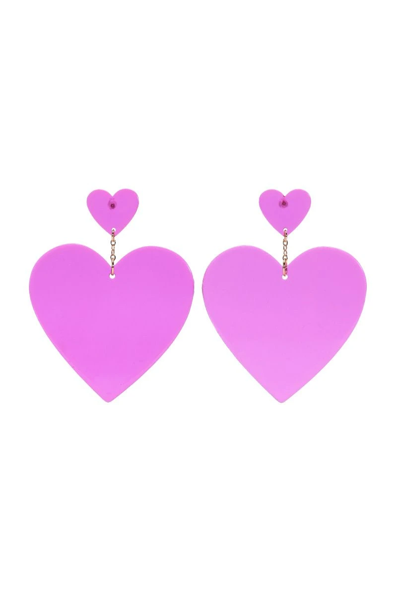 The AKIRA Label Sweet Like Sugar Statement Drop Earrings feature a small acrylic heart stud connected by a small chain to a larger statement acrylic heart in a drop silhouette.. Complete with post back-style closures.