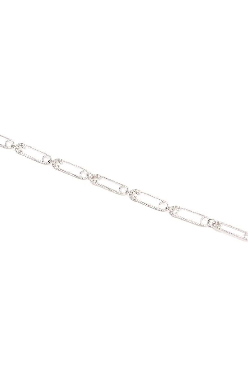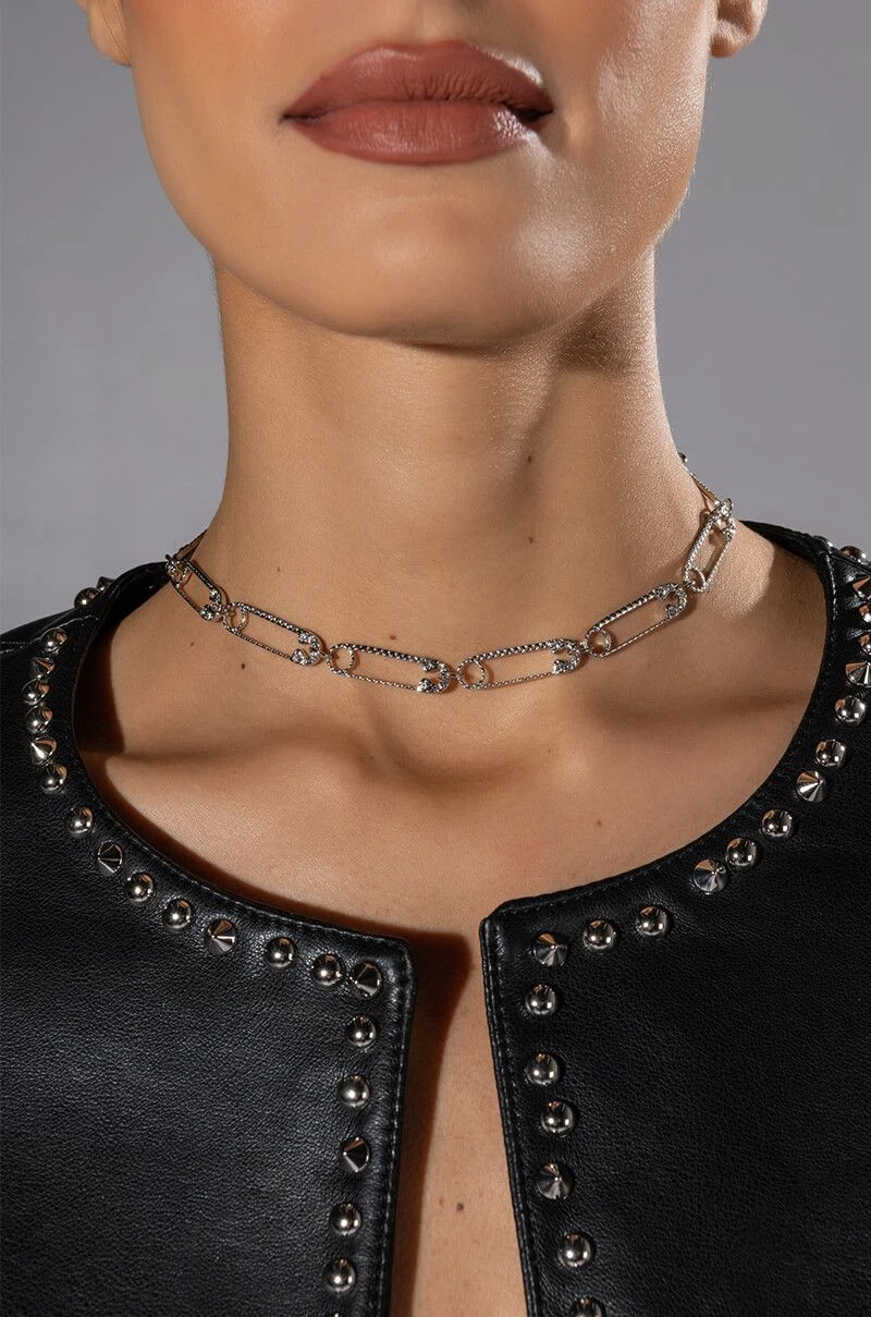 We donβt play around with The AKIRA Label Take Caution Rhinestone Paperclip Choker! This edgy necklace features a faux silver metal base, a rhinestone embellished paperclip chain link design, a choker necklace silhouette, and a lobster claw chain closure.