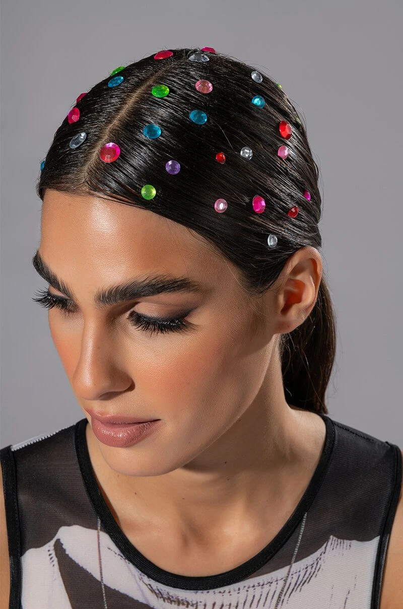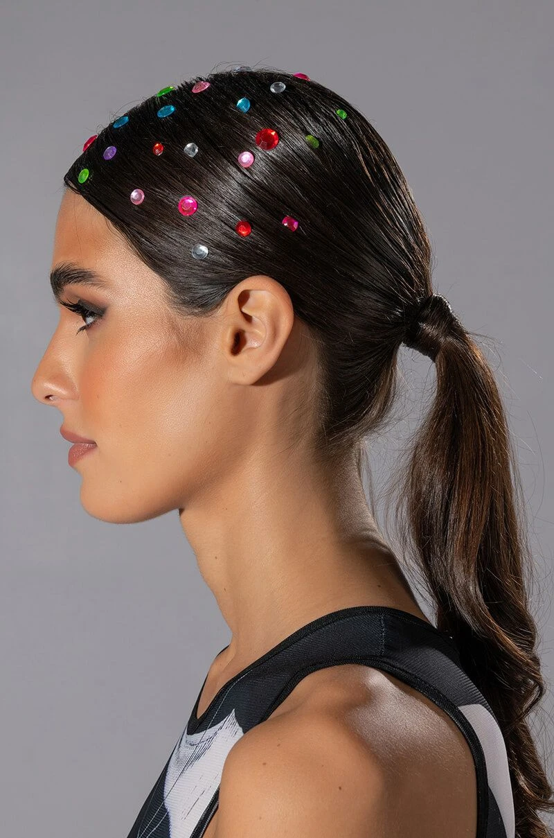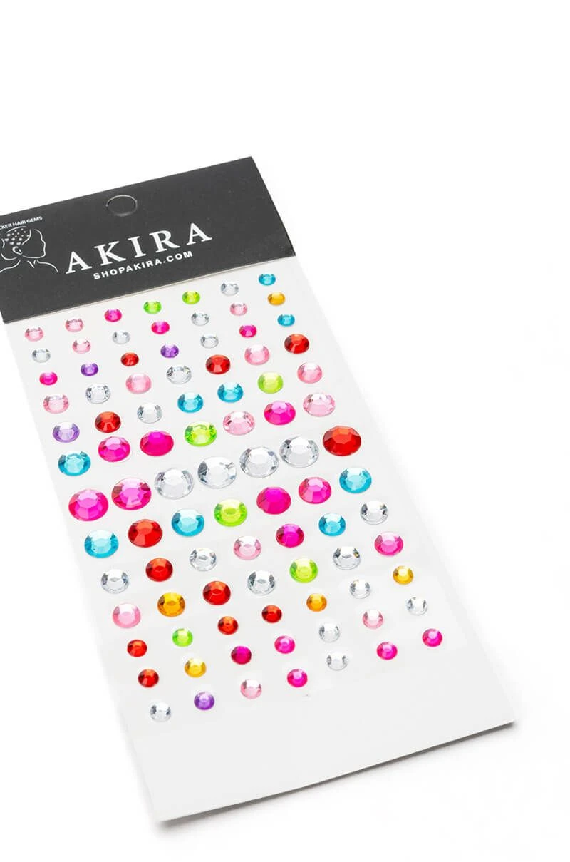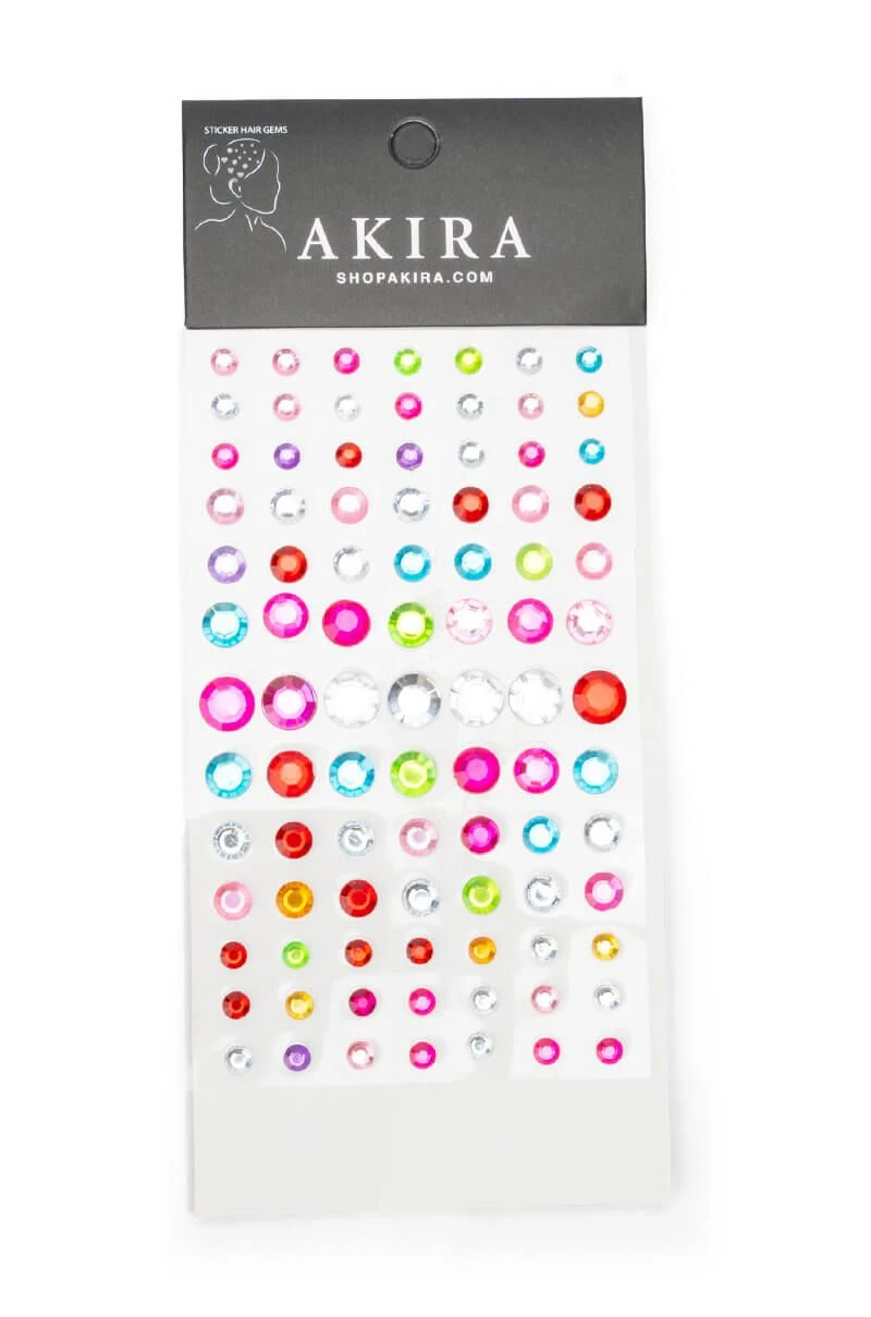 This is the mane event, are you ready? The AKIRA Label Main Event Hair Gem Stickers in Multi are an adhesive, single use hair accessory featuring colorful, multi-faceted rhinestone stickers of various sizes on a clear backing. This sheet includes 58 rhinestone hair gem stickers.