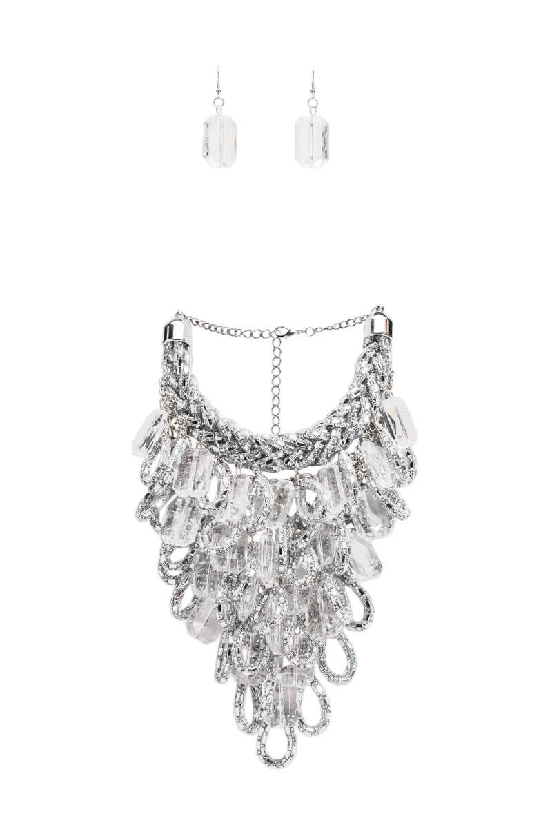 The Too Icy Embellished Statement Necklace Set features a braided, rhinestone-embellished choker base with cascading open teardrops, coordinating rhinestone and gem detailing, clear gems, and an adjustable lobster claw closure. Complete with coordinating clear gem fish hook earrings.
