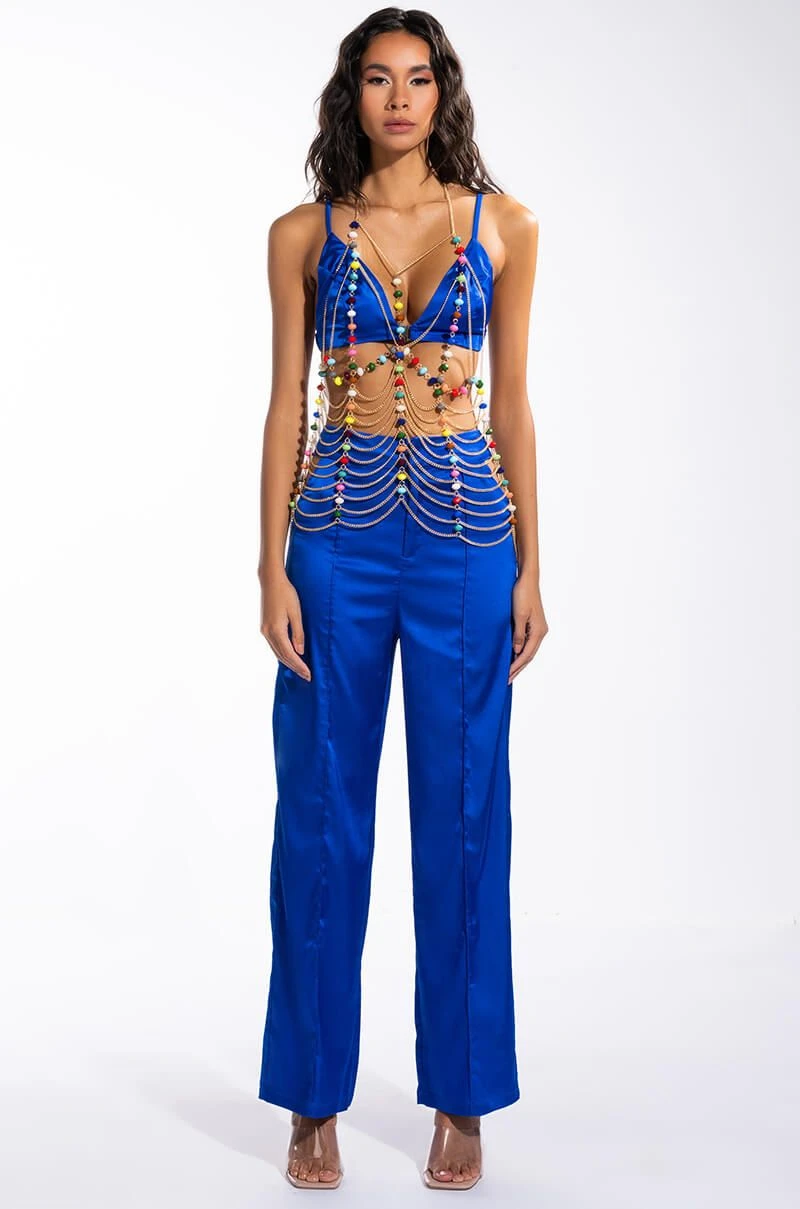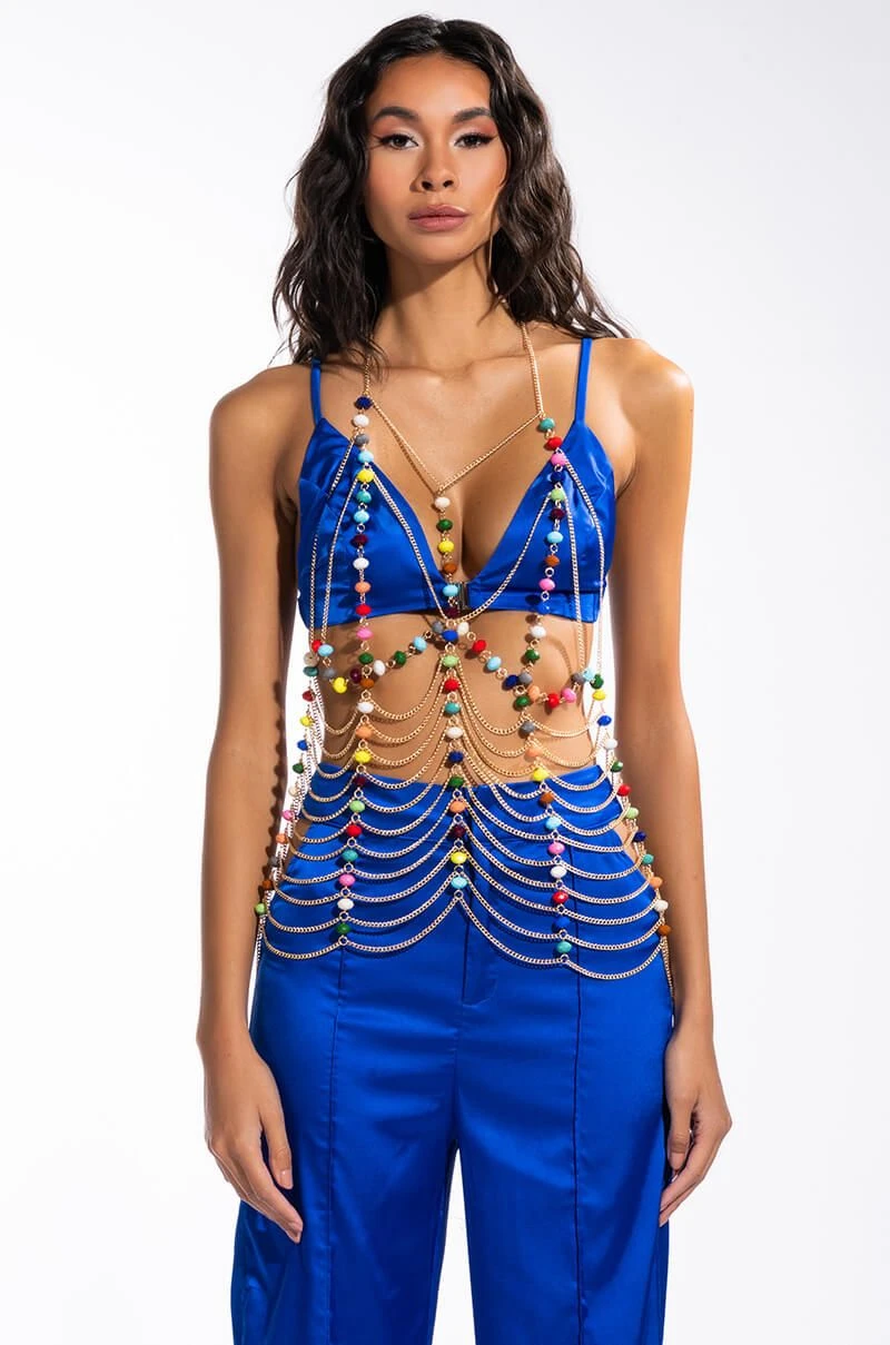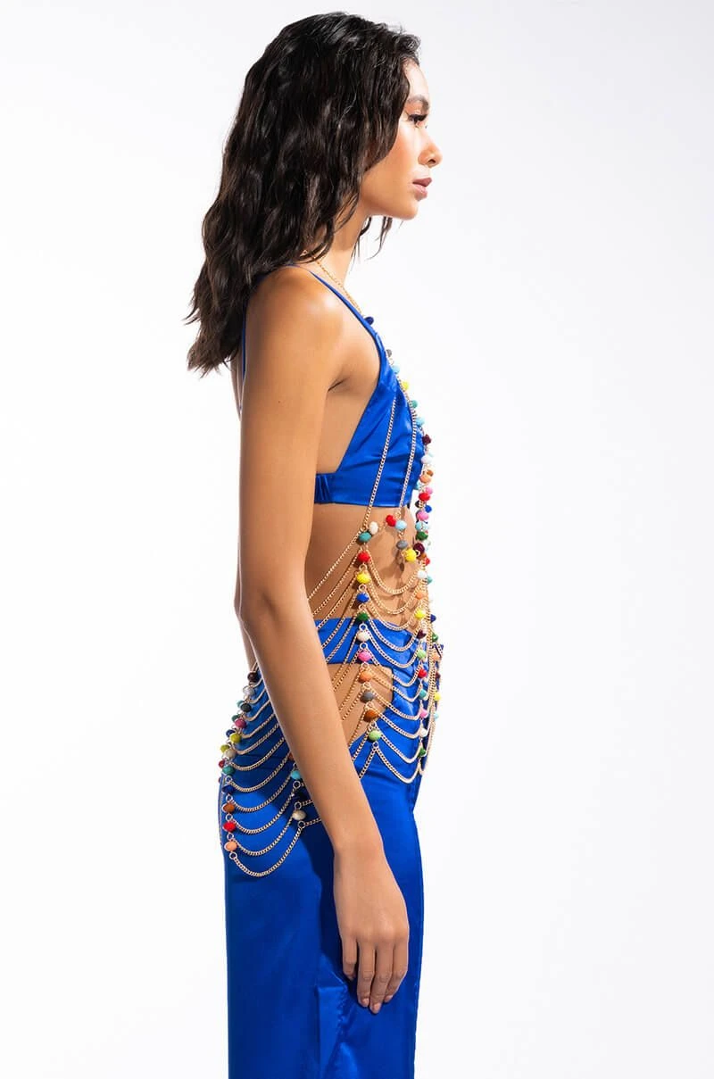 The AKIRA Label Tropical Fantasy Body Chain Bra features a faux gold chain link base, a halter neckline, a draped extended tank silhouette, multifaceted beaded detailing, lattice-style design, and an open back. Complete with lobster claw clasp closures at the neck and back. Slips effortlessly atop your bikinis and cut offs.