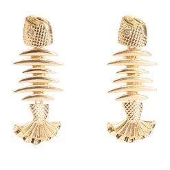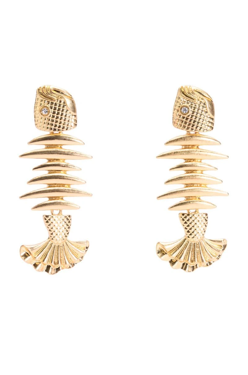 The AKIRA Label Upstream Dangle Earrings are made from a faux gold metal base and feature a dangled silhouette with an elaborate fishbone design, gem eye fish head lobe posts, and post back-style closures.