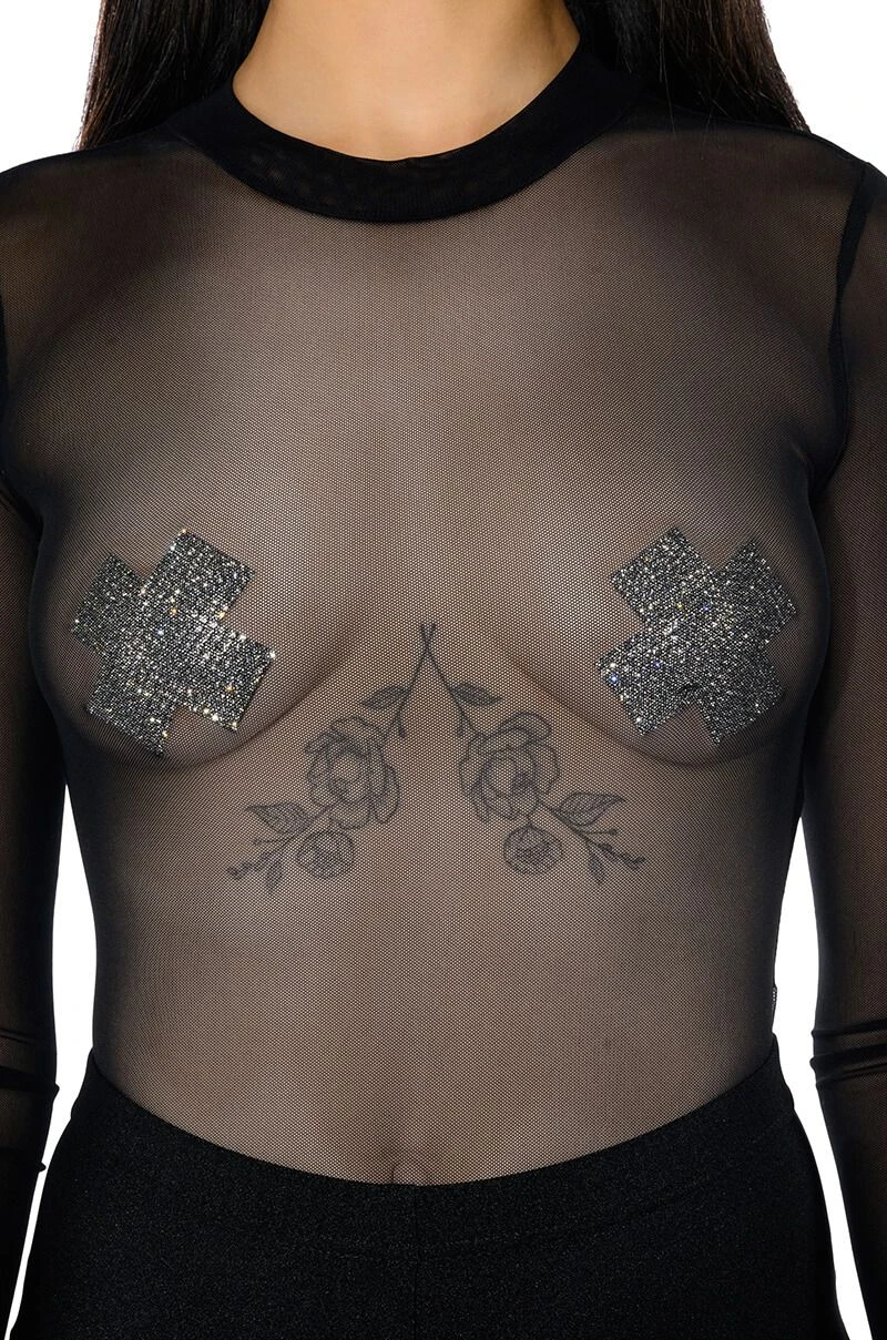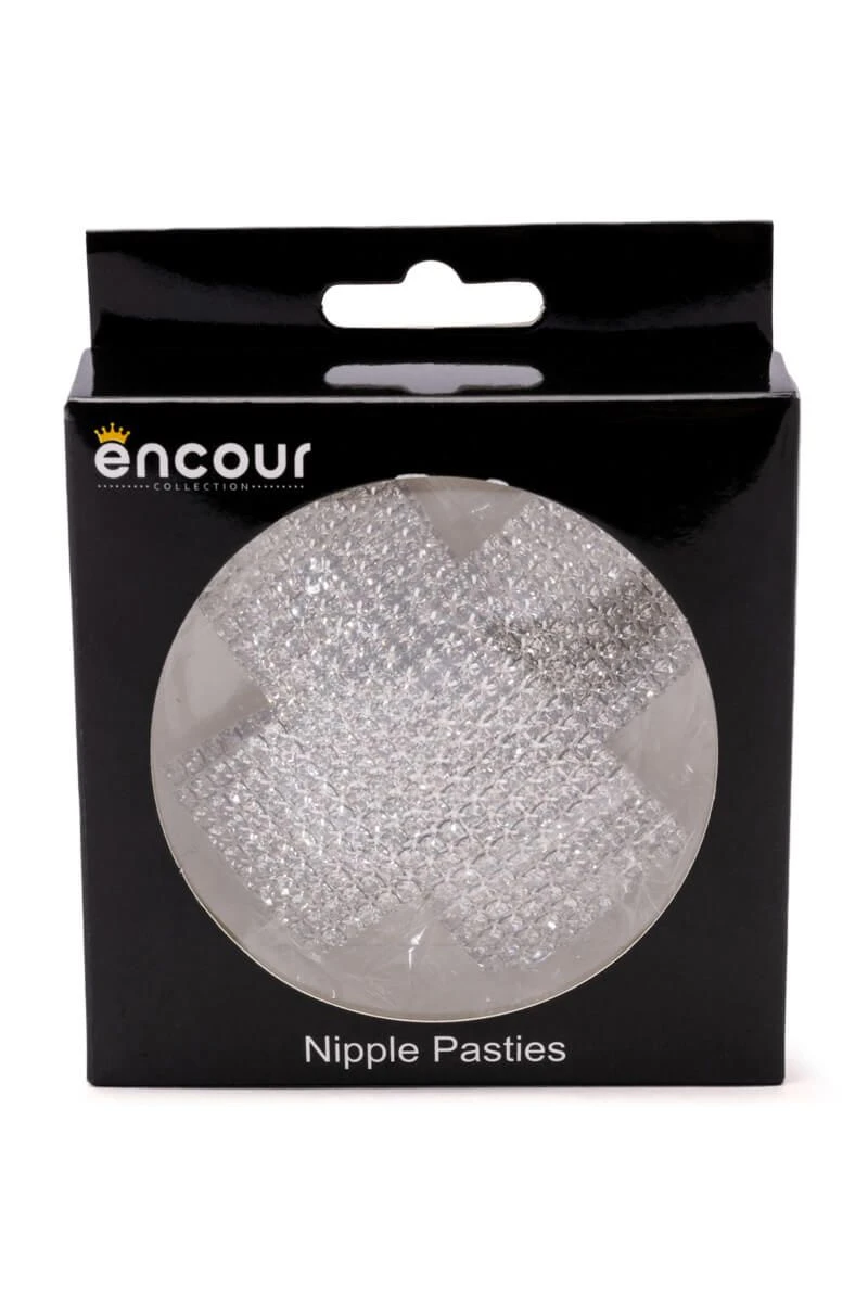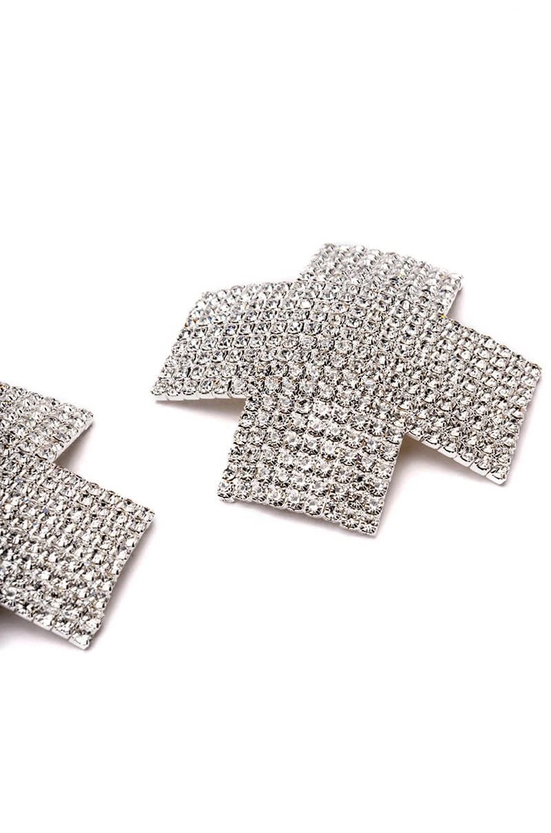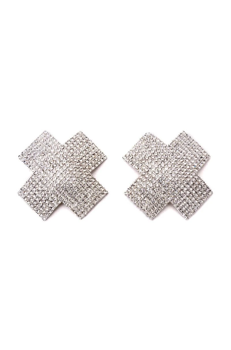 The Encour X Marks The Spot Embellished Nip Sticker features an X-shaped metallic base with rhinestone embellishments, and reusable, medical grade adhesive backing.