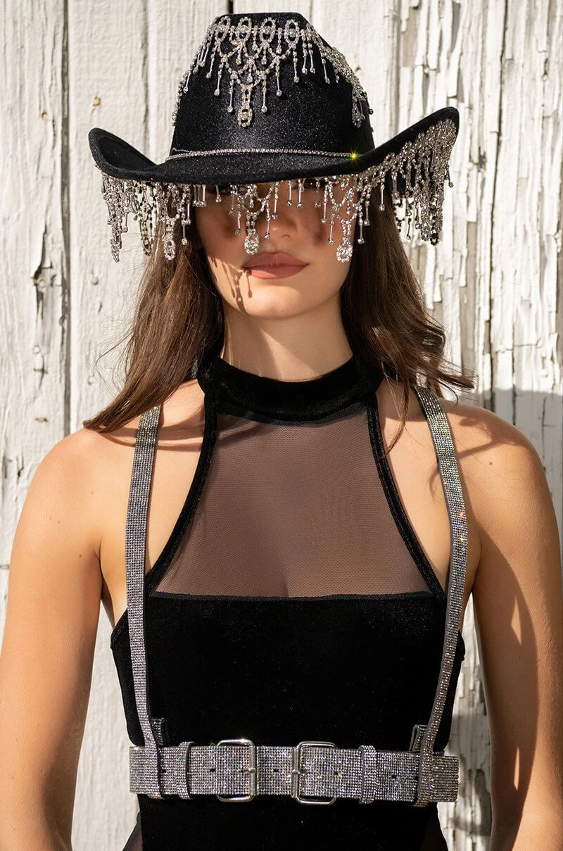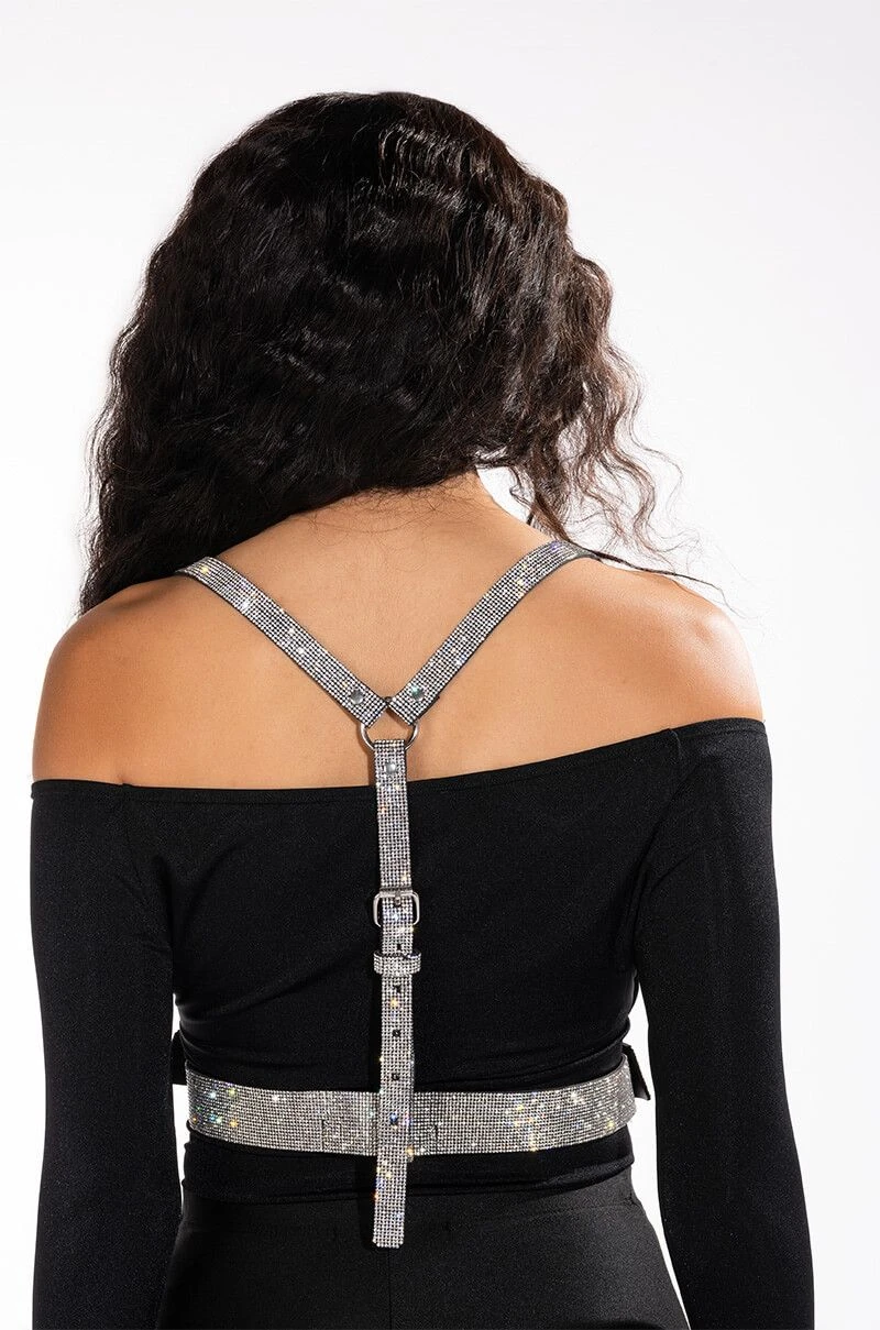 Add to cart ASAP! Just say βyes,β to The AKIRA Label Yes Indeed Rhinestone Harness. This unique layering piece features a vegan leather base, a racerback silhouette, a sparkly rhinestone overlay, o-ring accents, buckle closures, and an adjustable underbust waistband. Try it over a long sleeve mesh dress for a fresh fit.